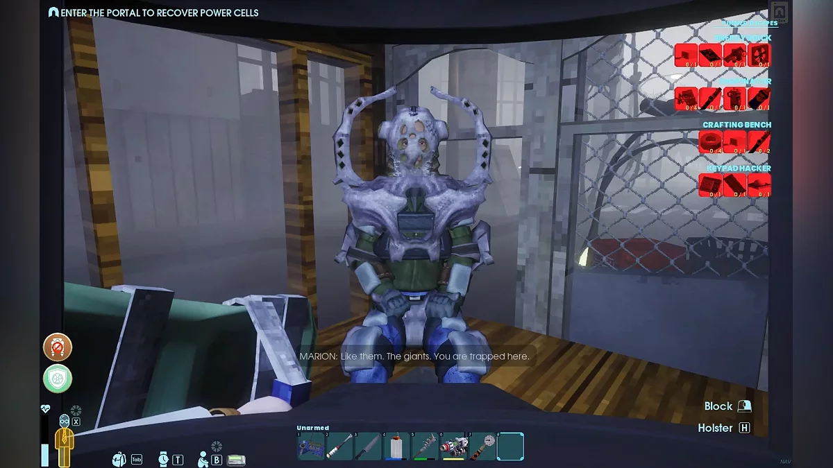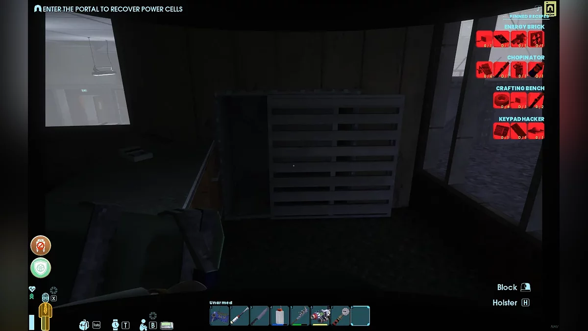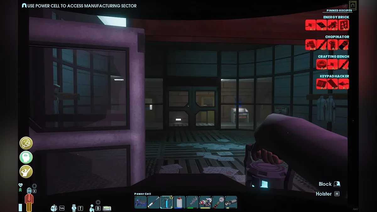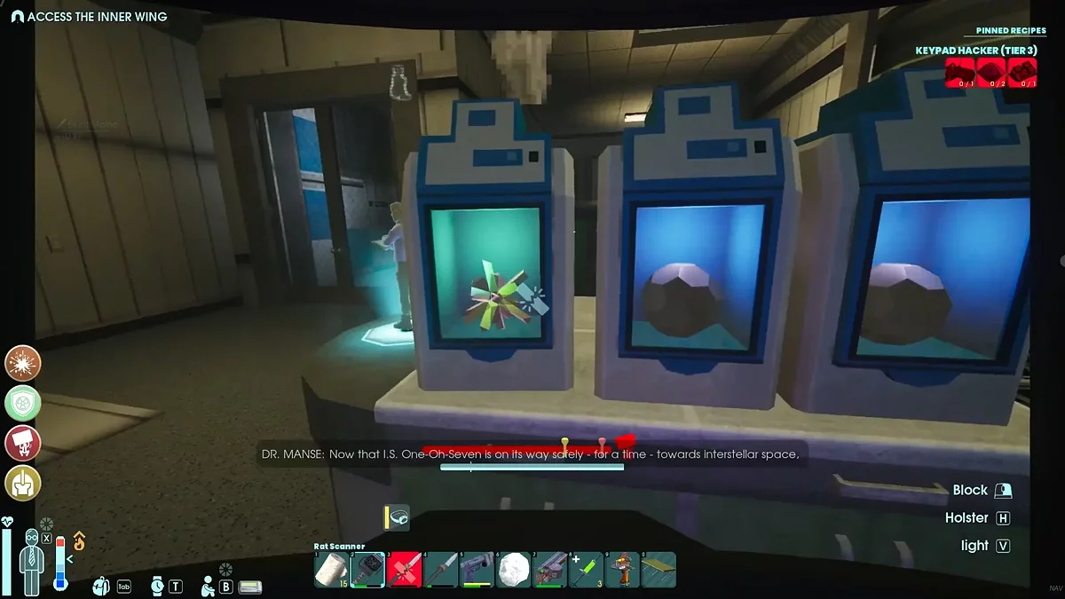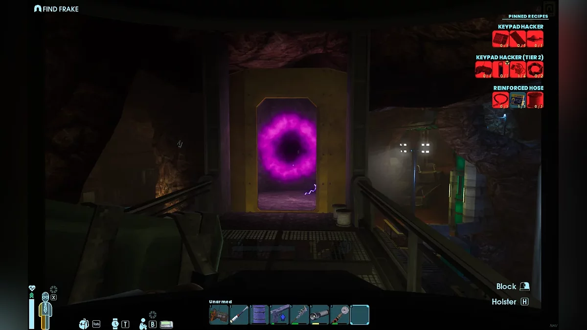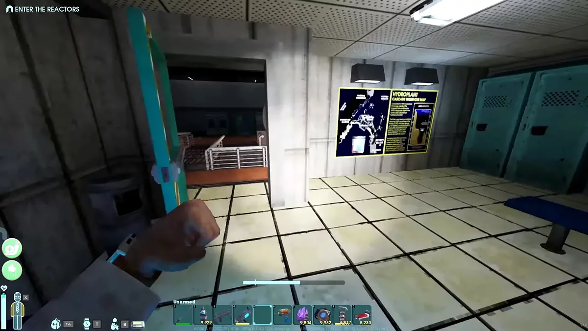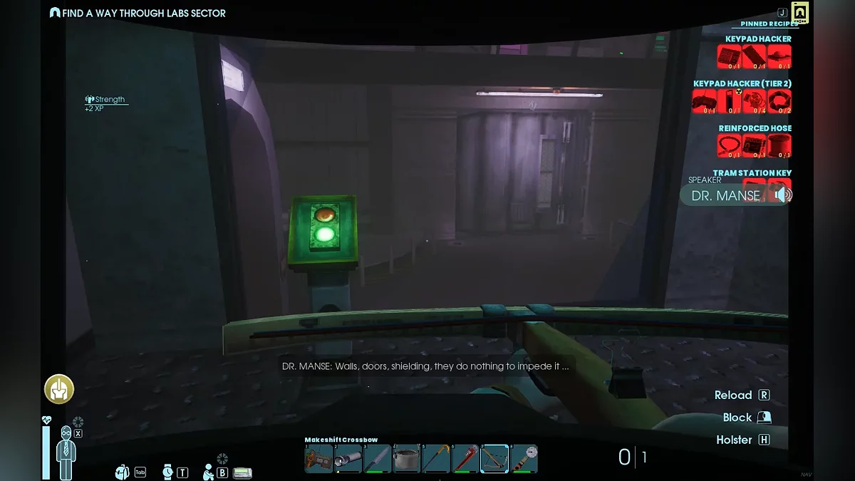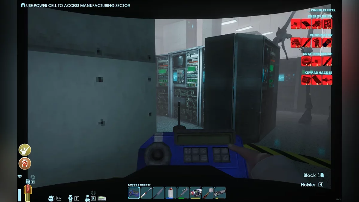 Снаружи вас ждет доктор Джагер. Чтобы попасть к нему, необходимо изготовить энергоблок и вставить его в отсек справа от дверей. Для этого надо предварительно поставить верстак где-нибудь неподалеку.