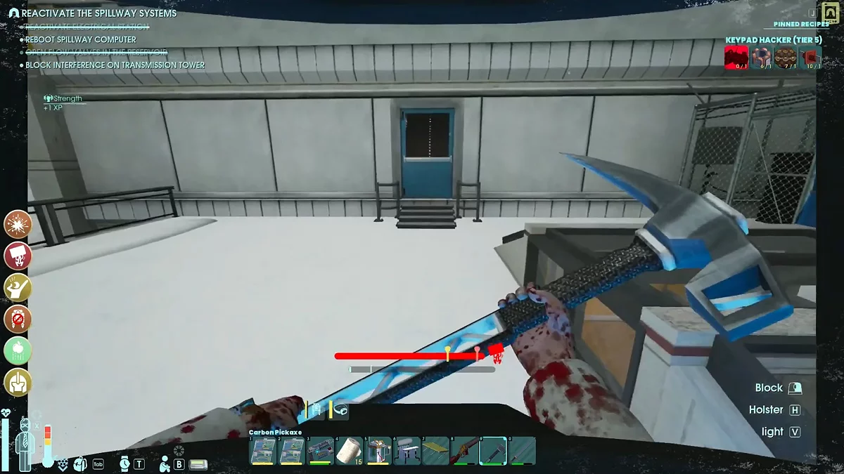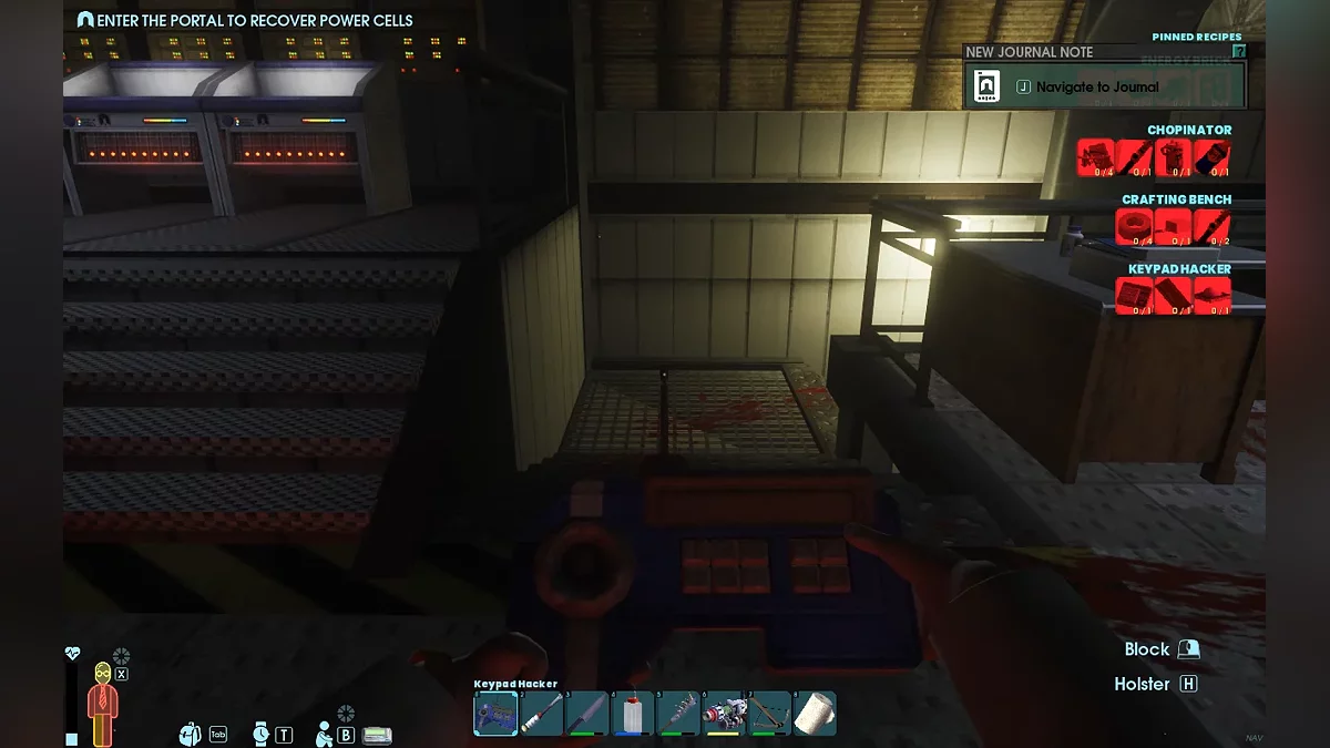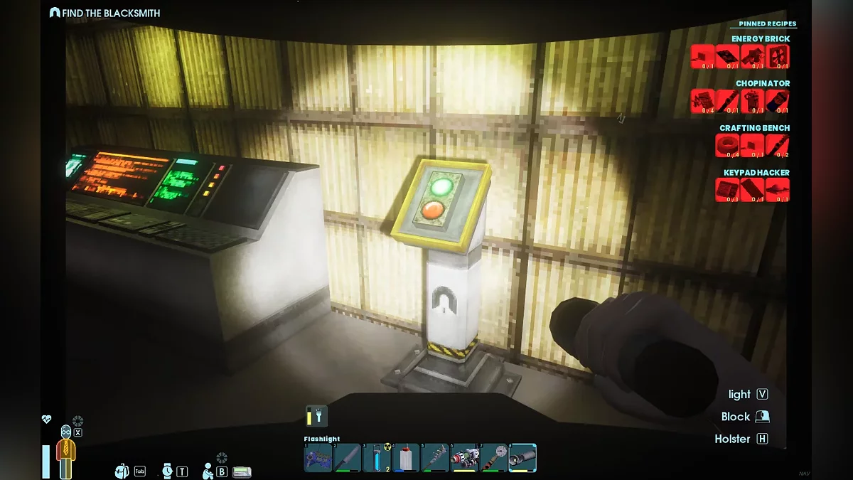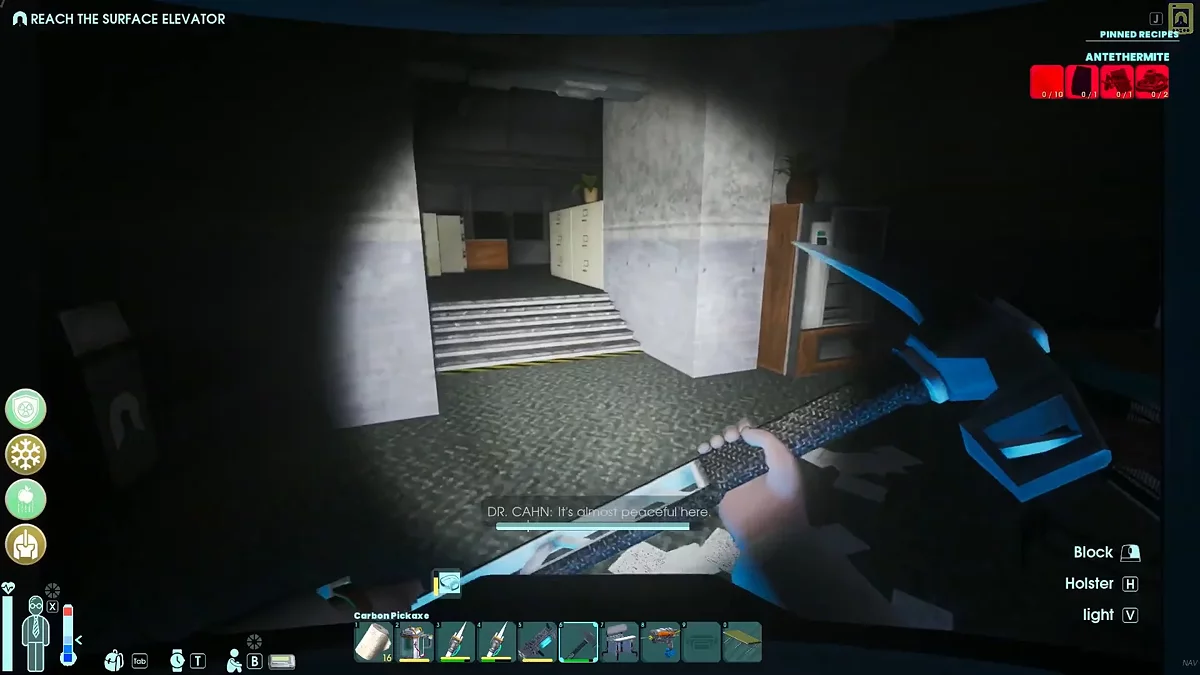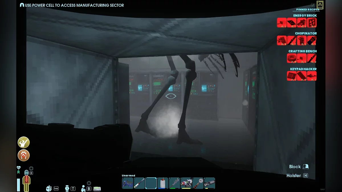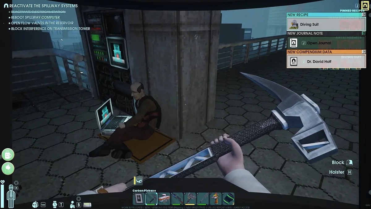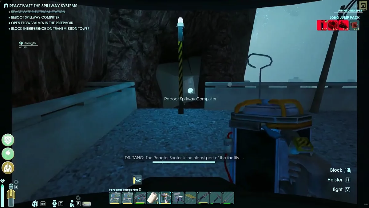 Снаружи вас ждет доктор Джагер. Чтобы попасть к нему, необходимо изготовить энергоблок и вставить его в отсек справа от дверей. Для этого надо предварительно поставить верстак где-нибудь неподалеку.