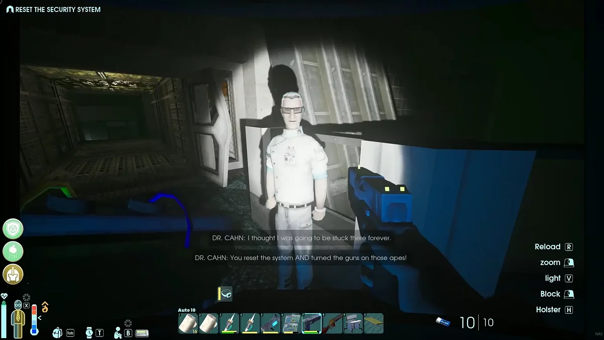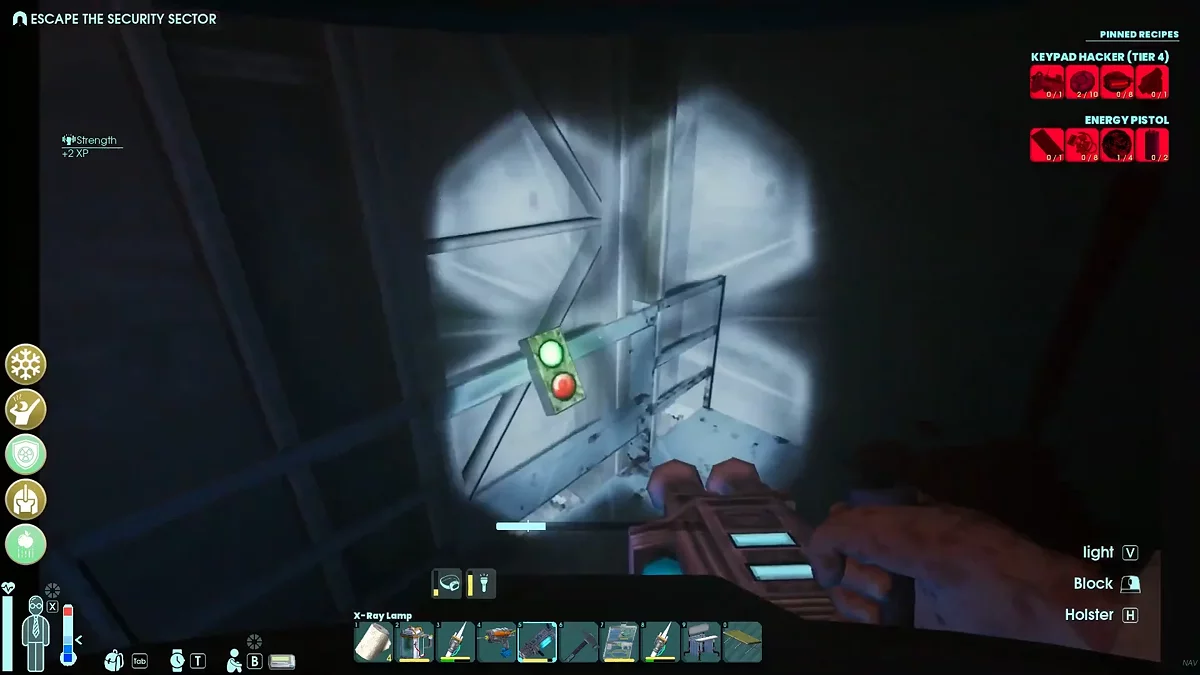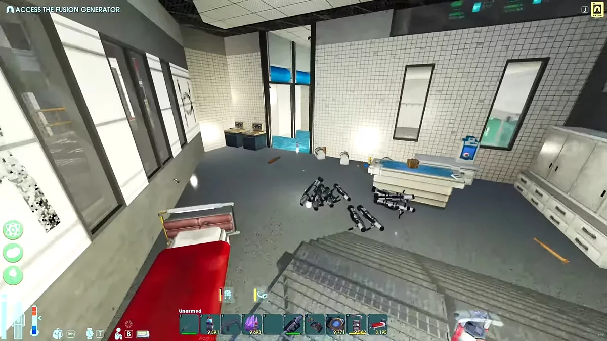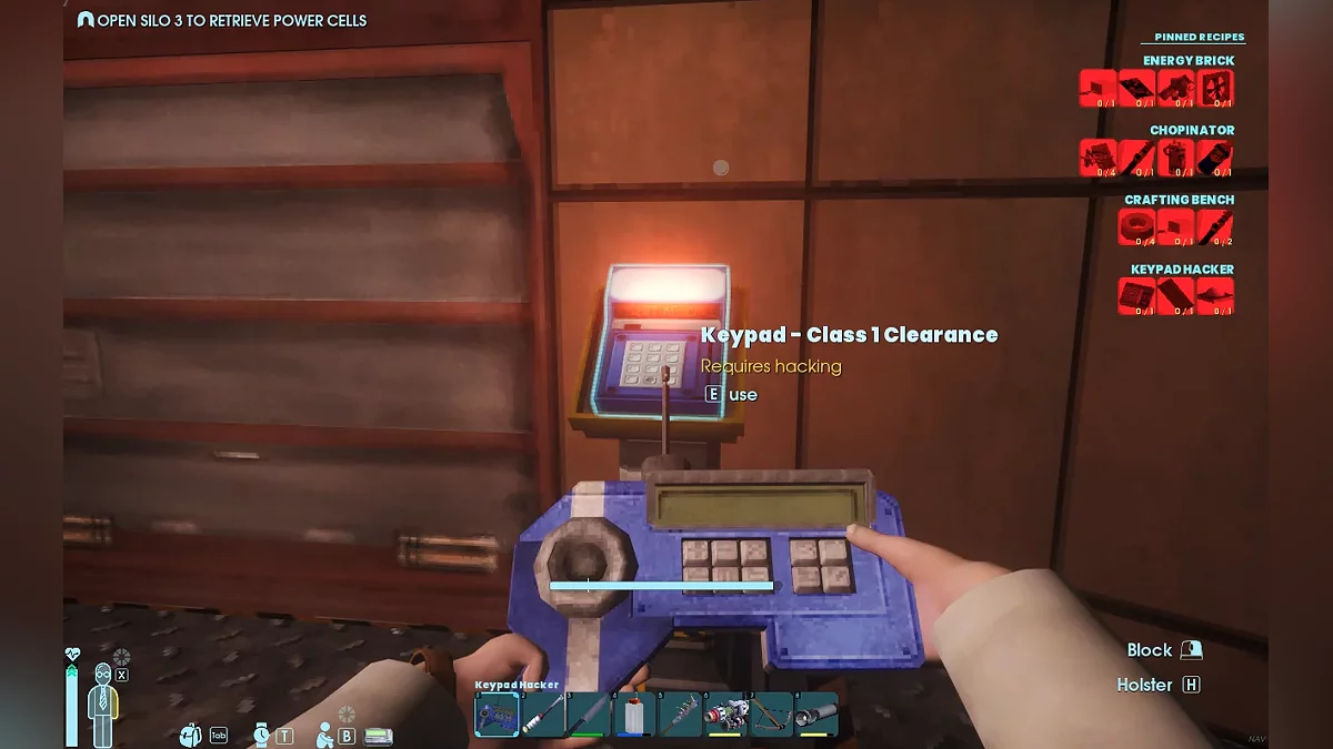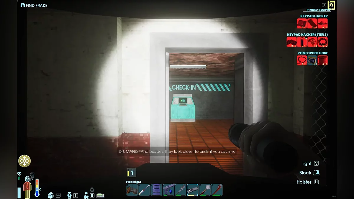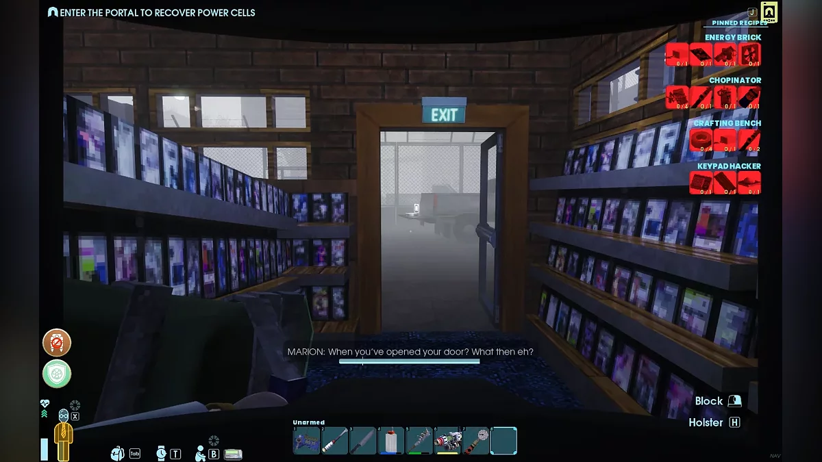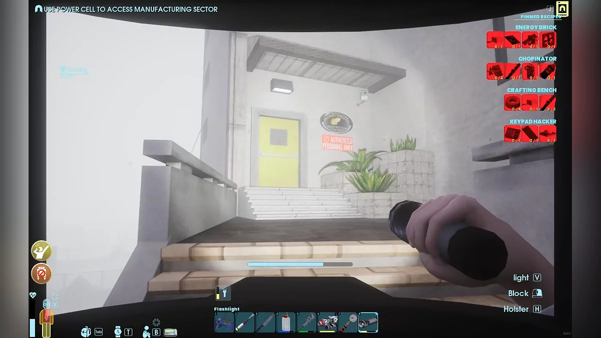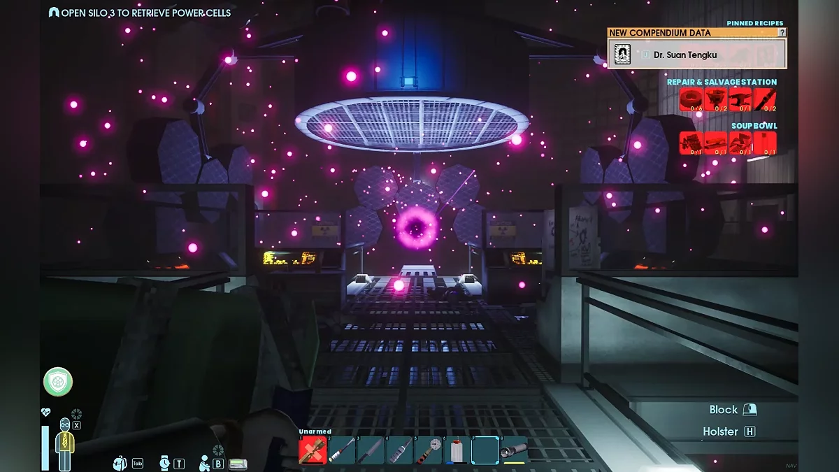 Снаружи вас ждет доктор Джагер. Чтобы попасть к нему, необходимо изготовить энергоблок и вставить его в отсек справа от дверей. Для этого надо предварительно поставить верстак где-нибудь неподалеку.