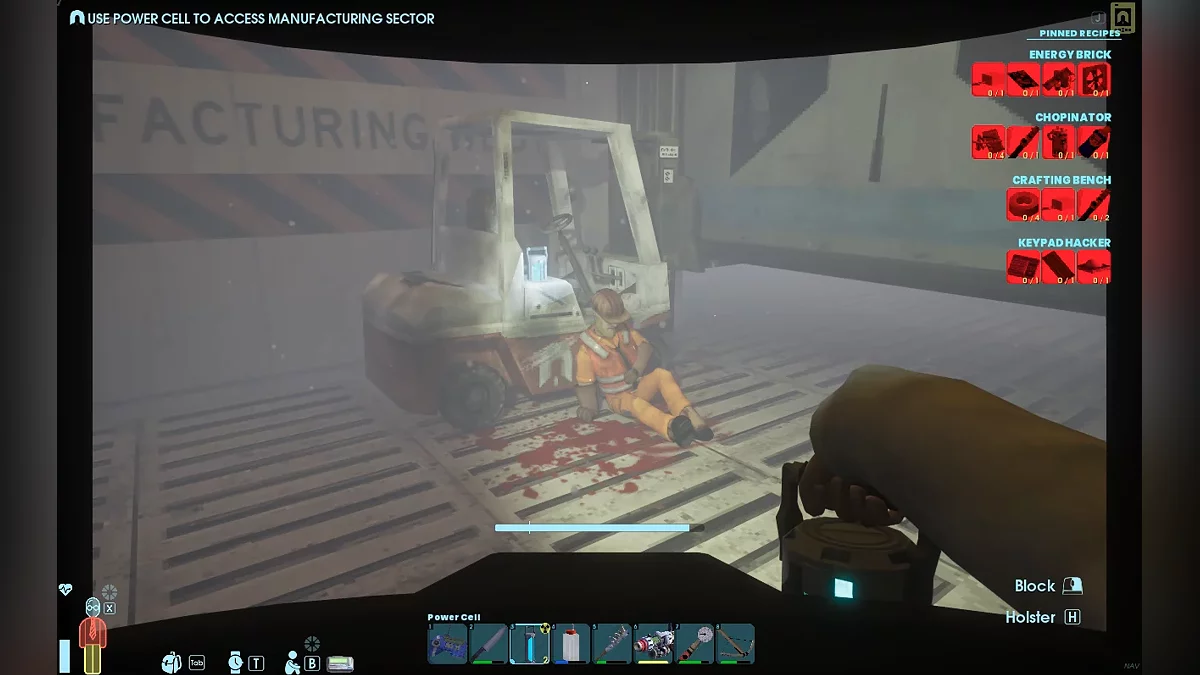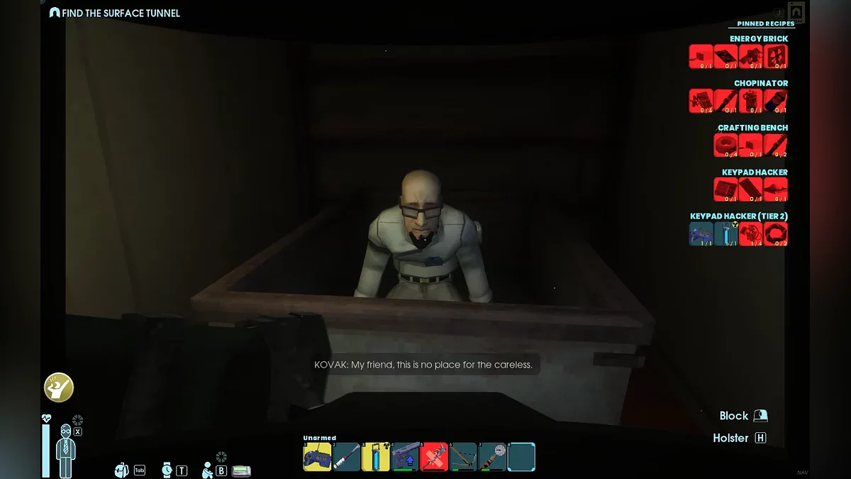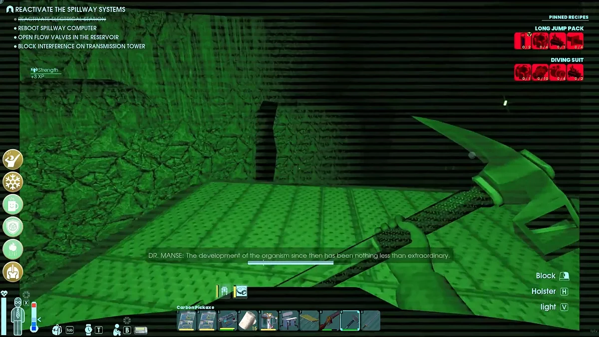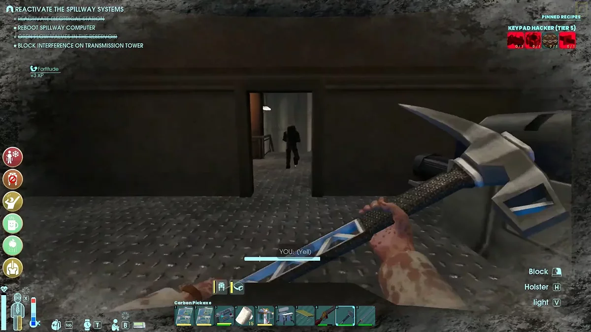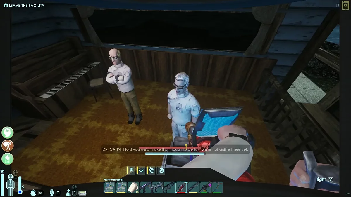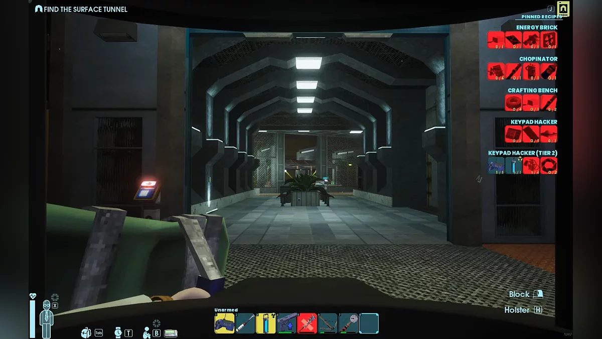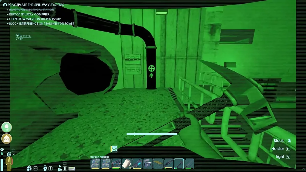 Снаружи вас ждет доктор Джагер. Чтобы попасть к нему, необходимо изготовить энергоблок и вставить его в отсек справа от дверей. Для этого надо предварительно поставить верстак где-нибудь неподалеку.