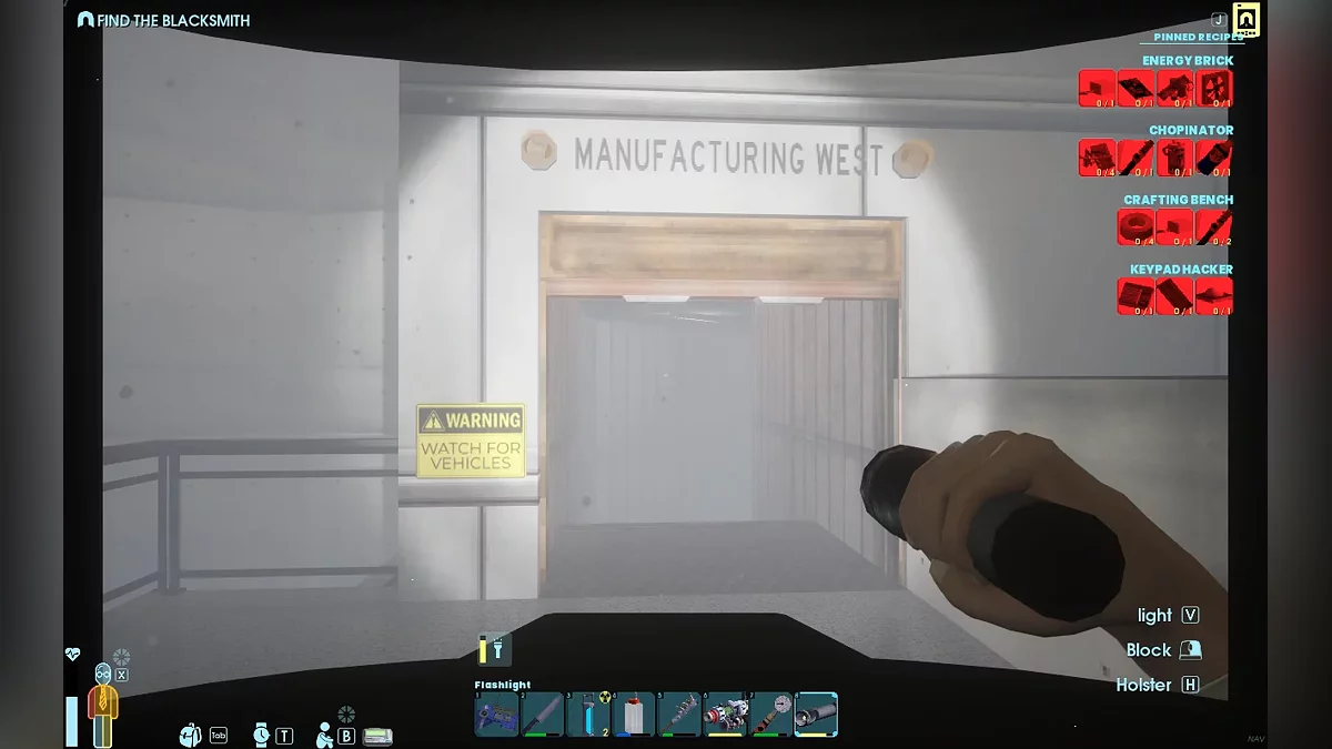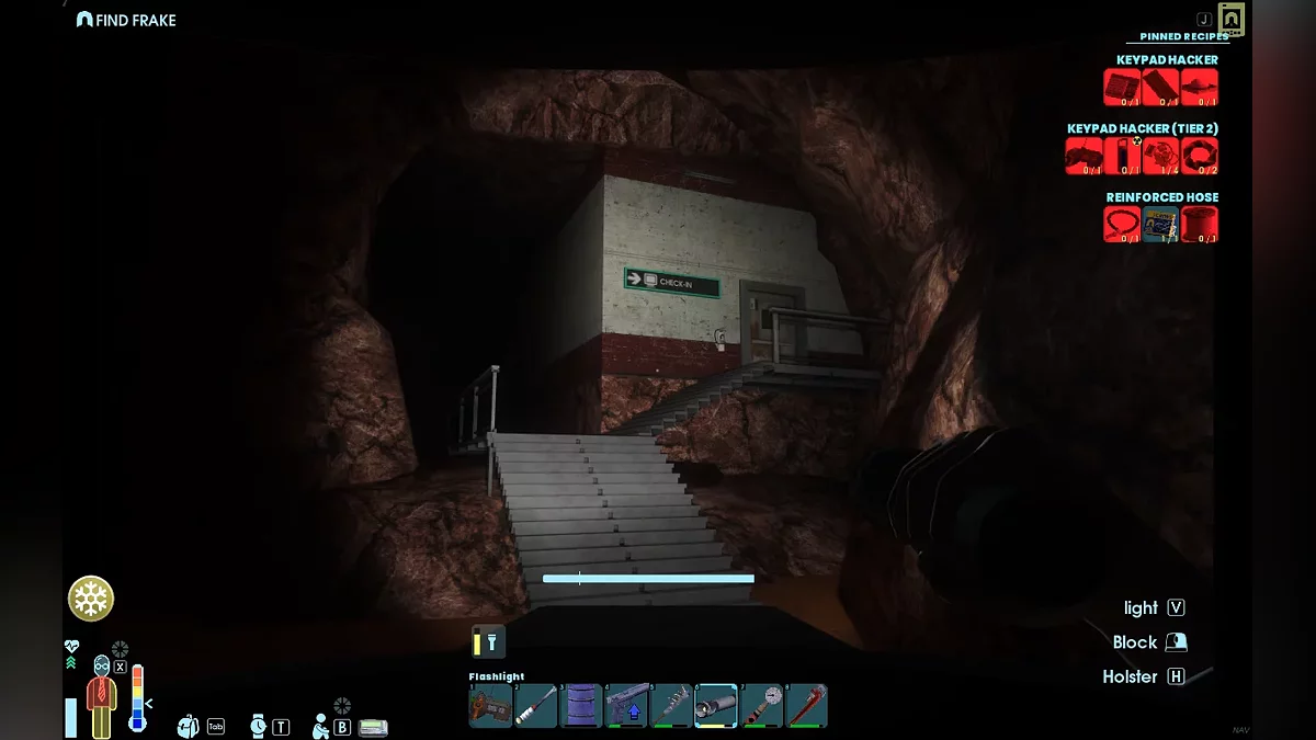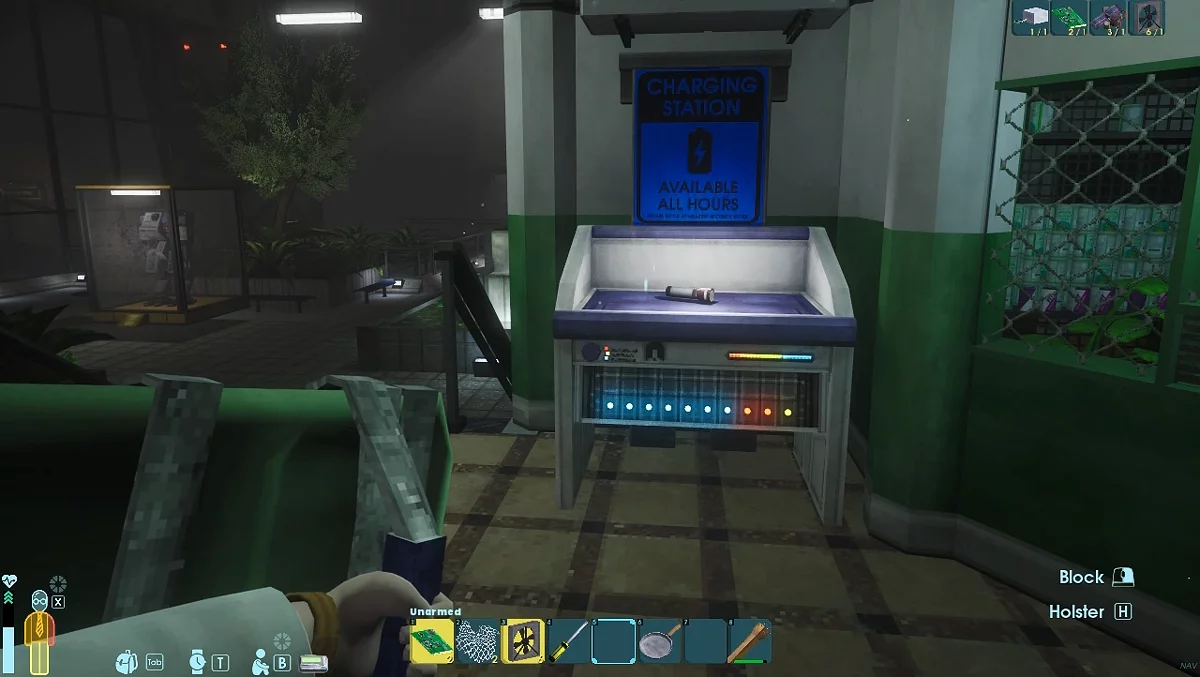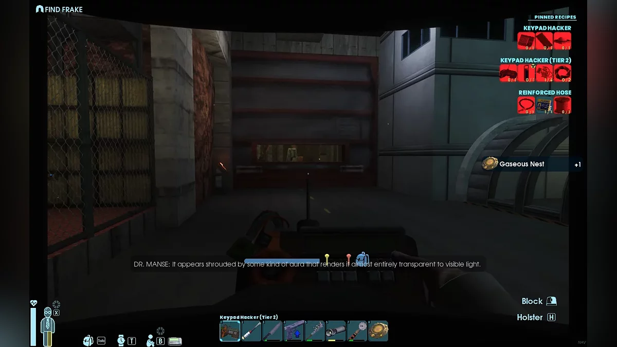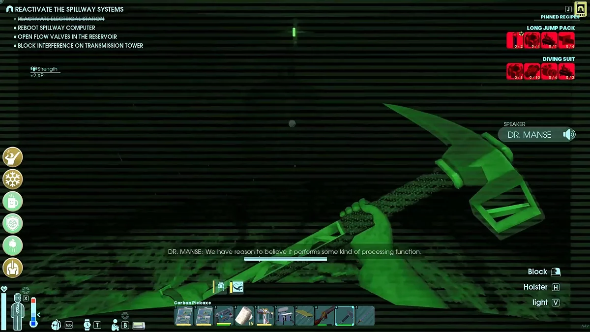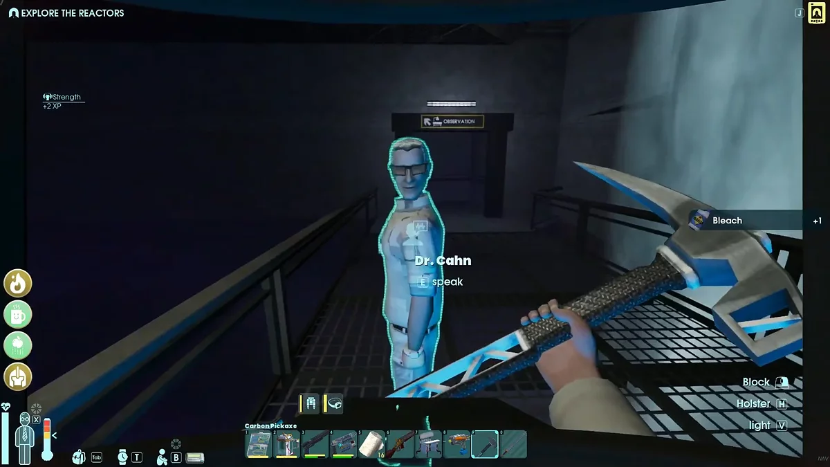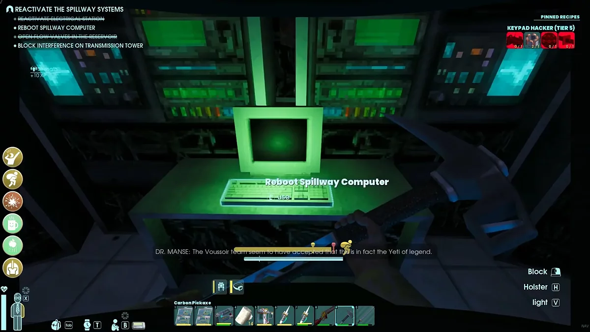 Снаружи вас ждет доктор Джагер. Чтобы попасть к нему, необходимо изготовить энергоблок и вставить его в отсек справа от дверей. Для этого надо предварительно поставить верстак где-нибудь неподалеку.
