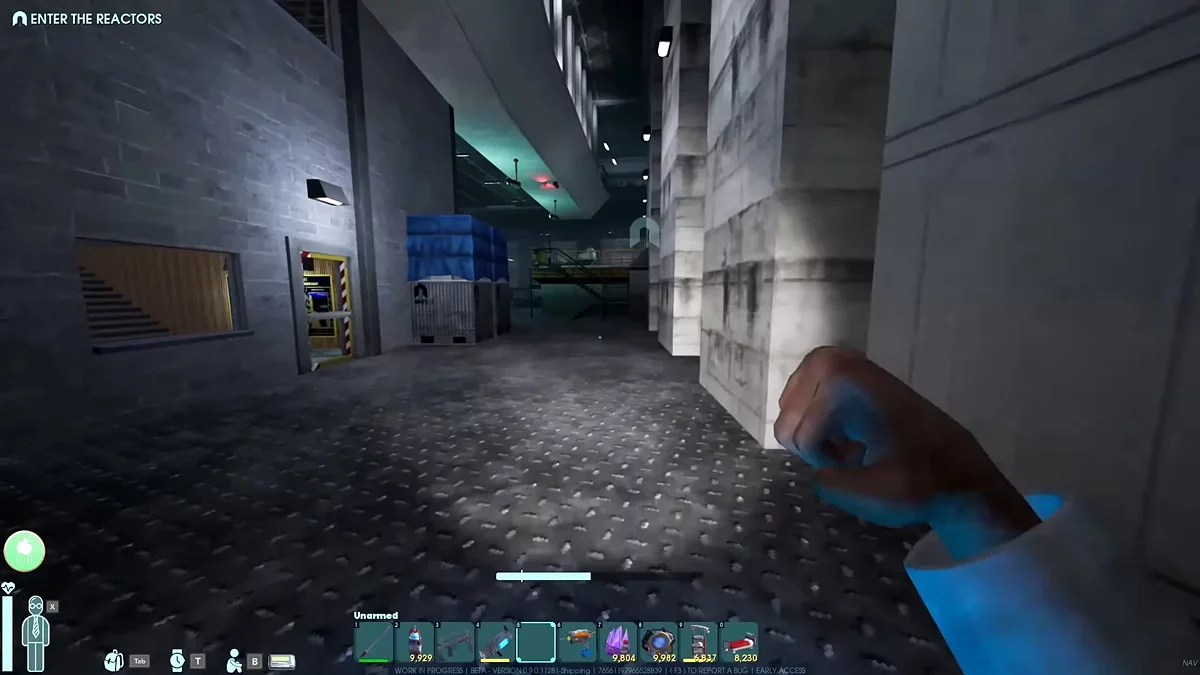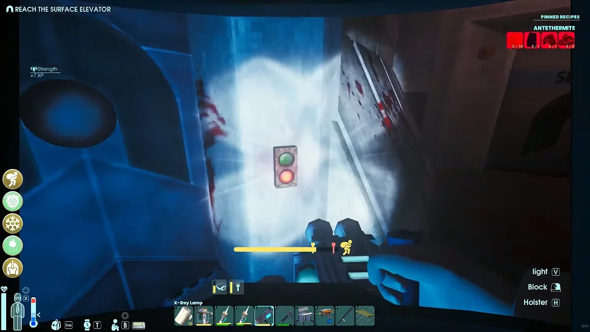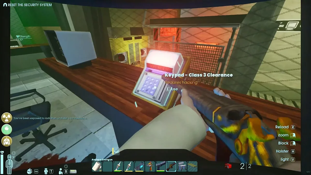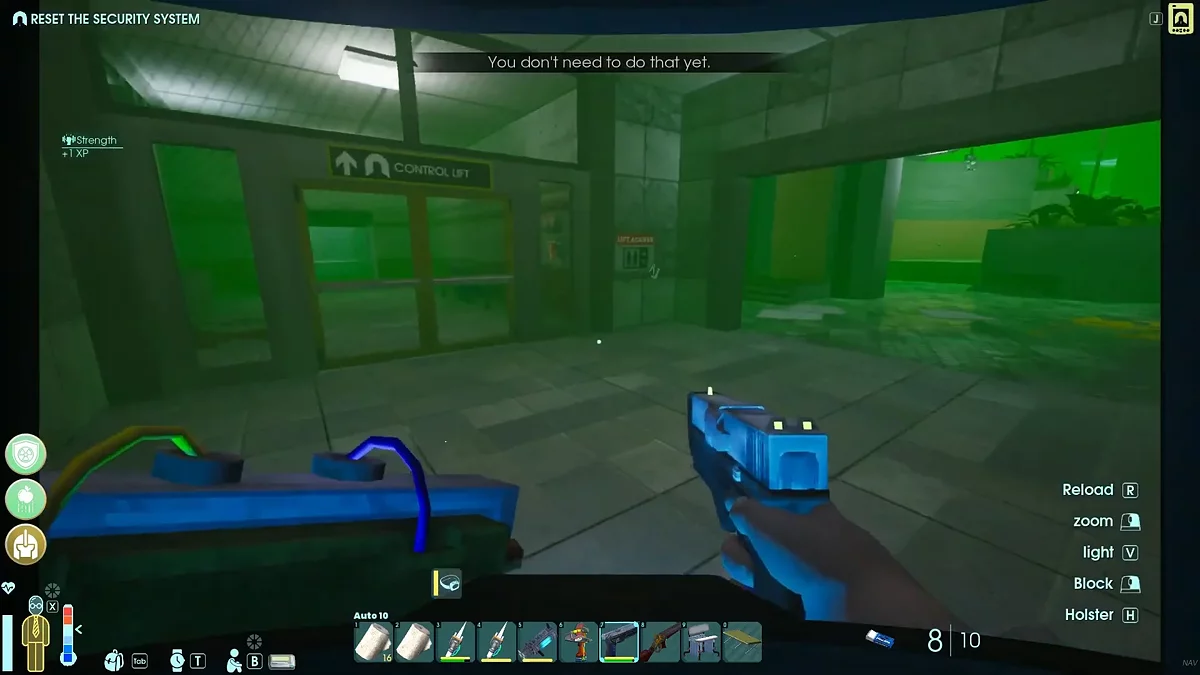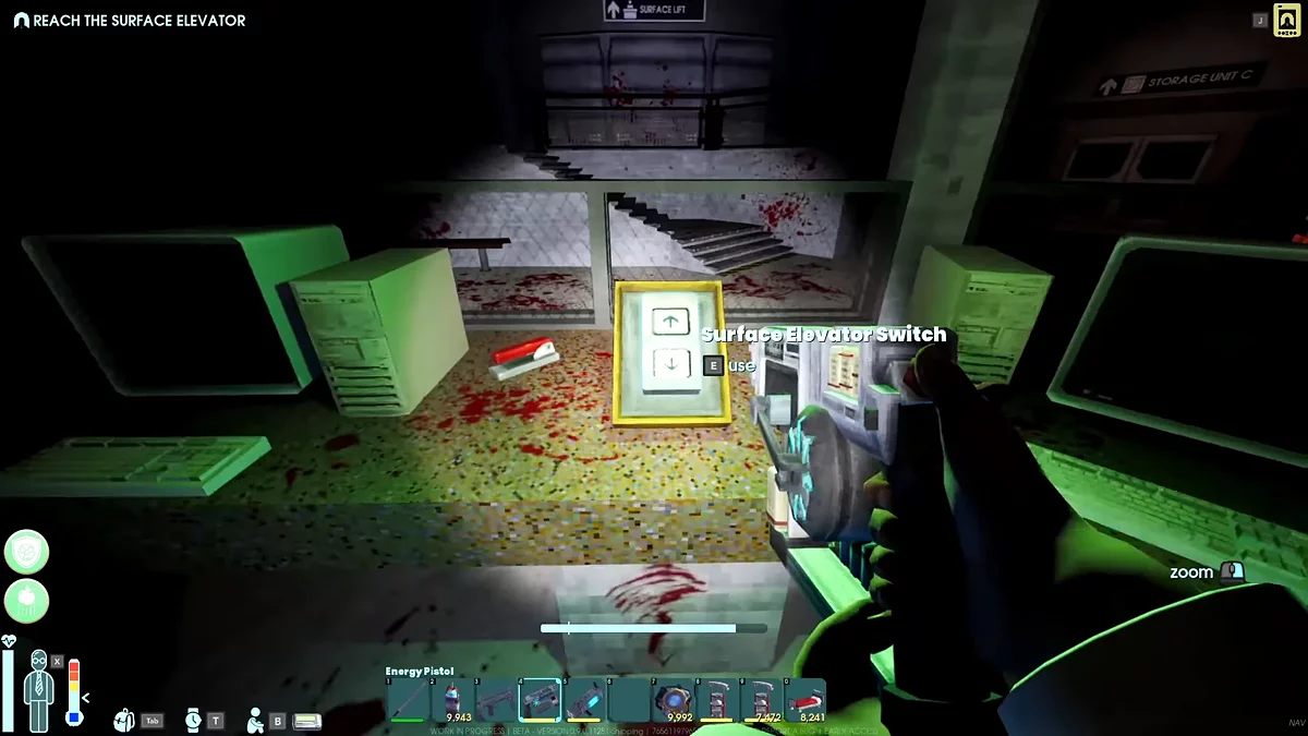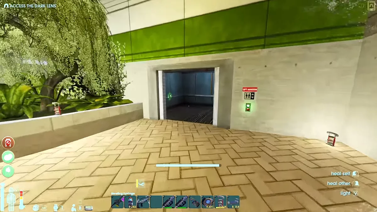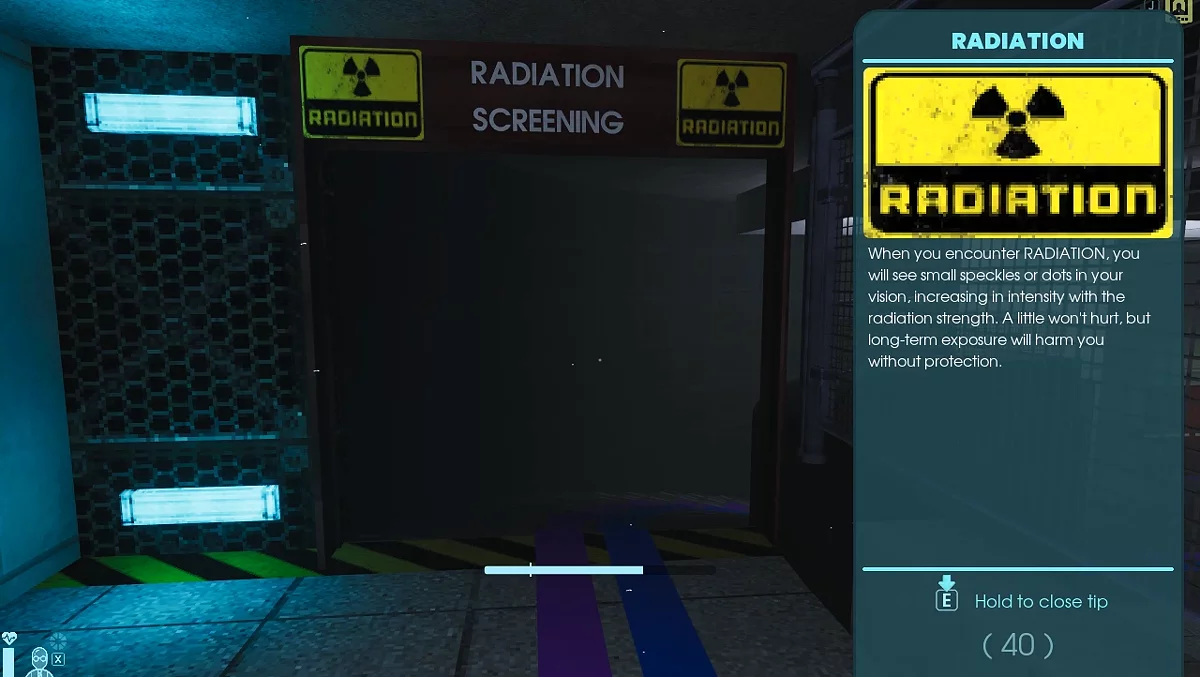 Познакомившись с индикаторами радиации и инвентарем, по синей дорожке на полу отправляйтесь к лифту.