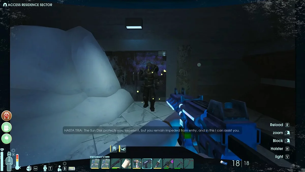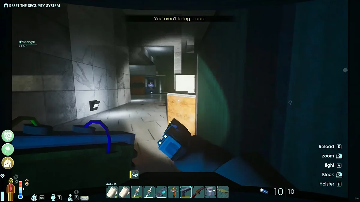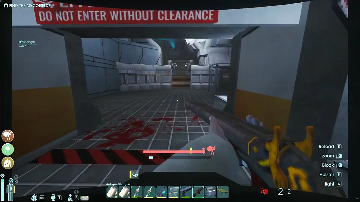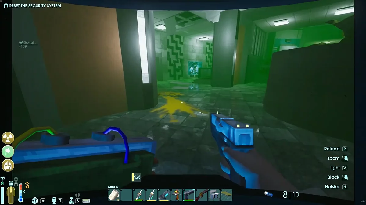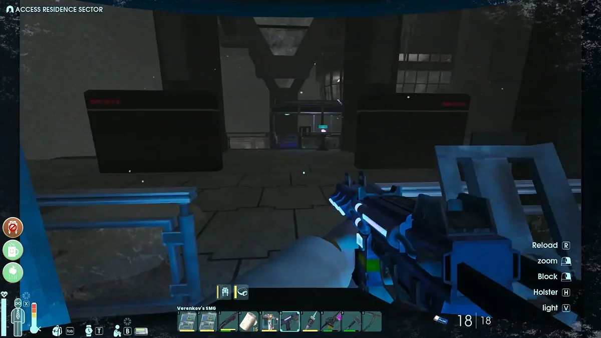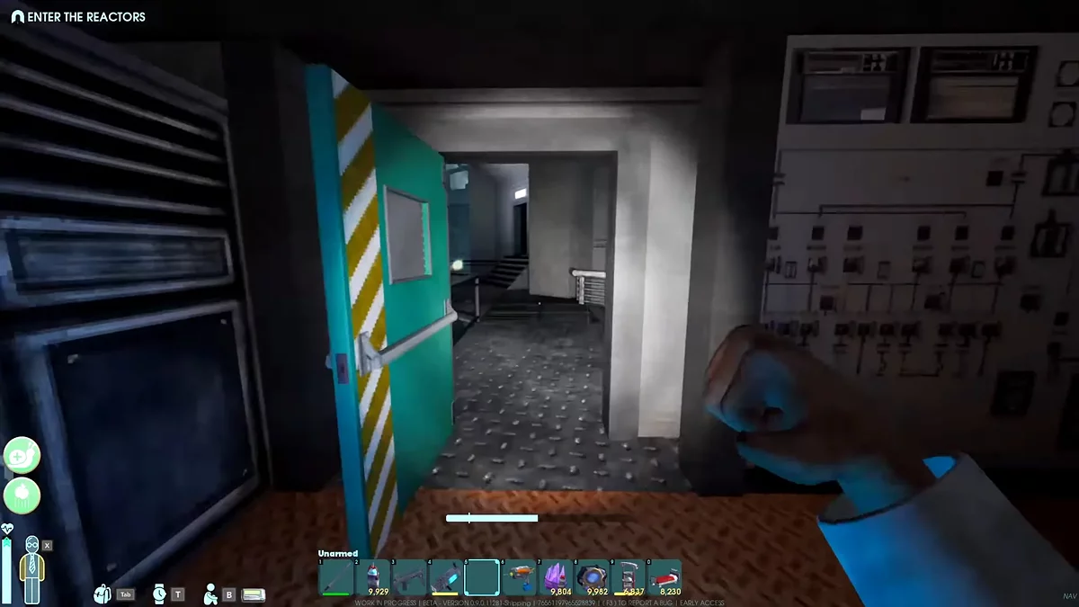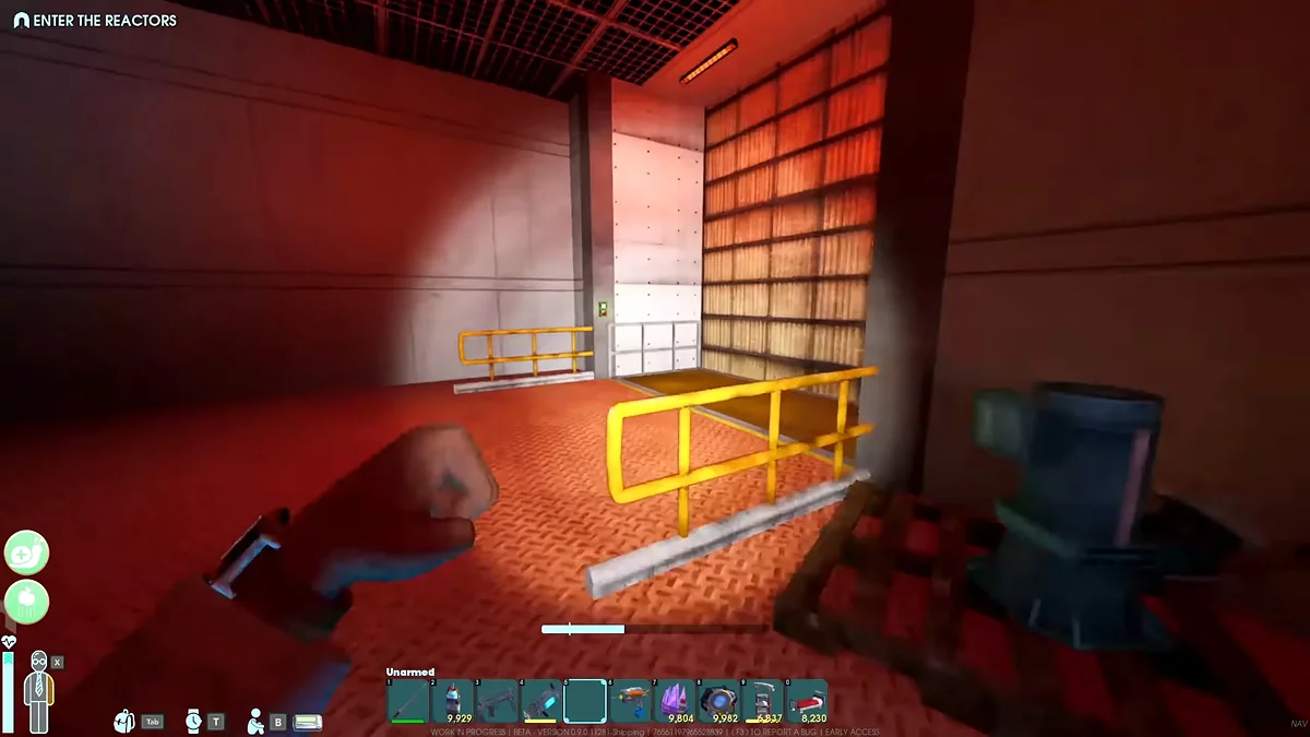 Познакомившись с индикаторами радиации и инвентарем, по синей дорожке на полу отправляйтесь к лифту.