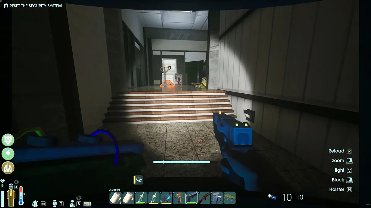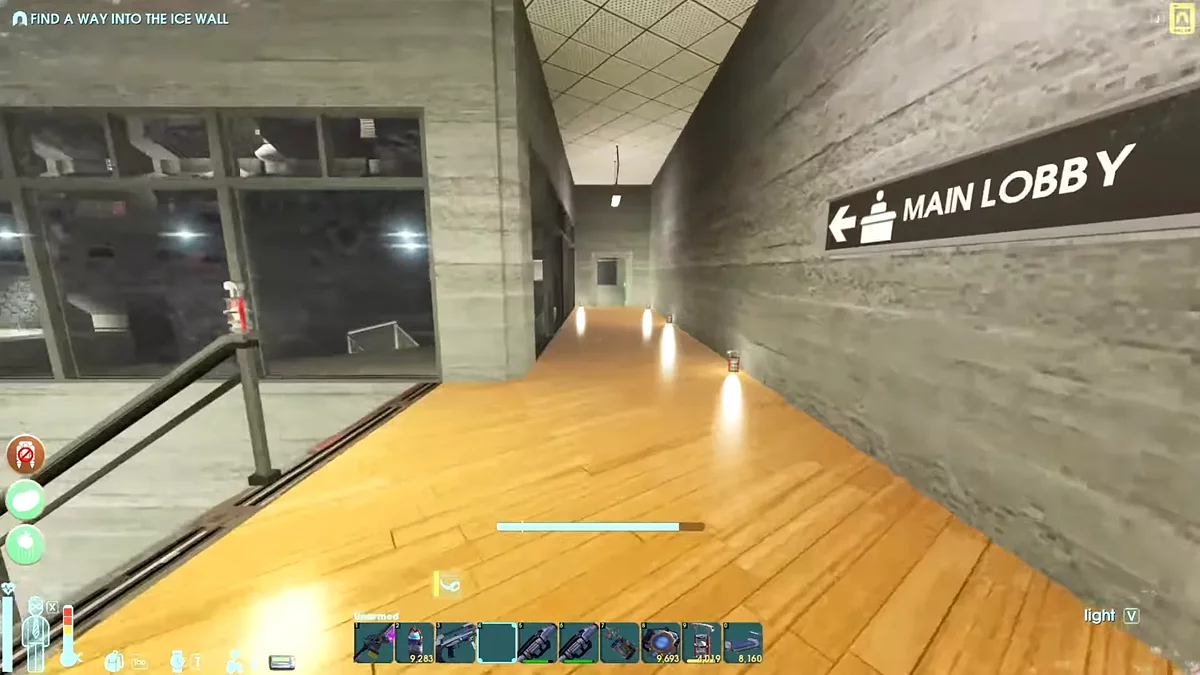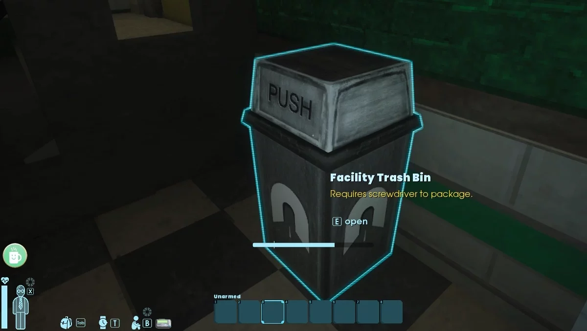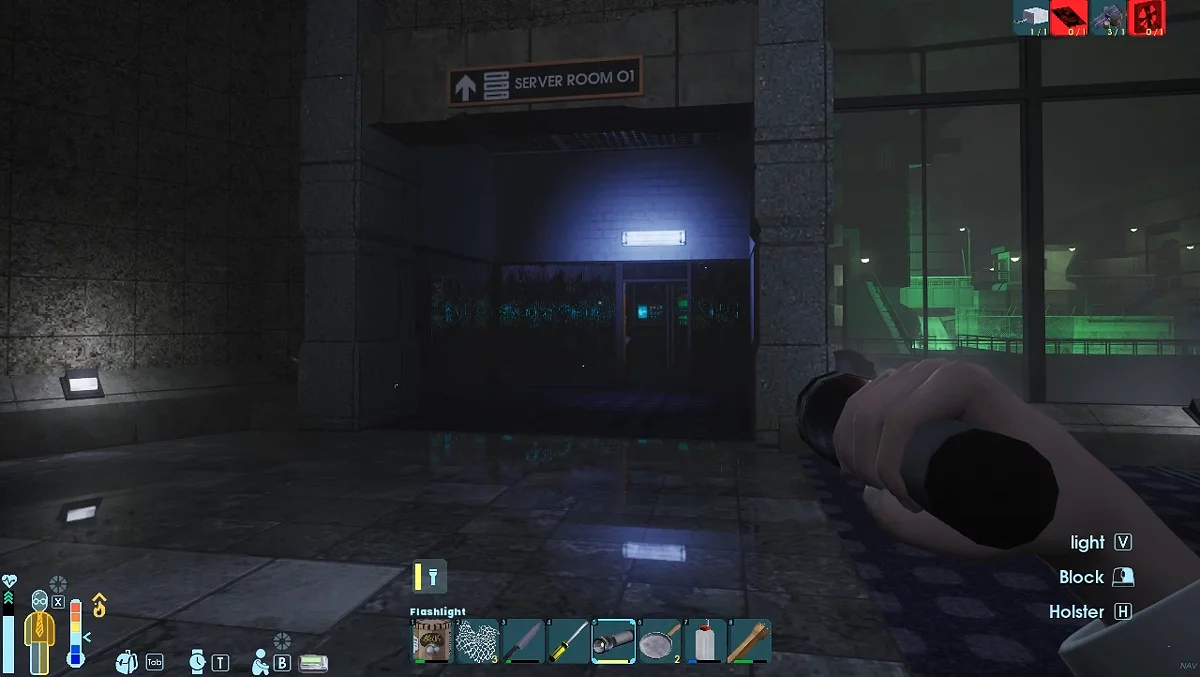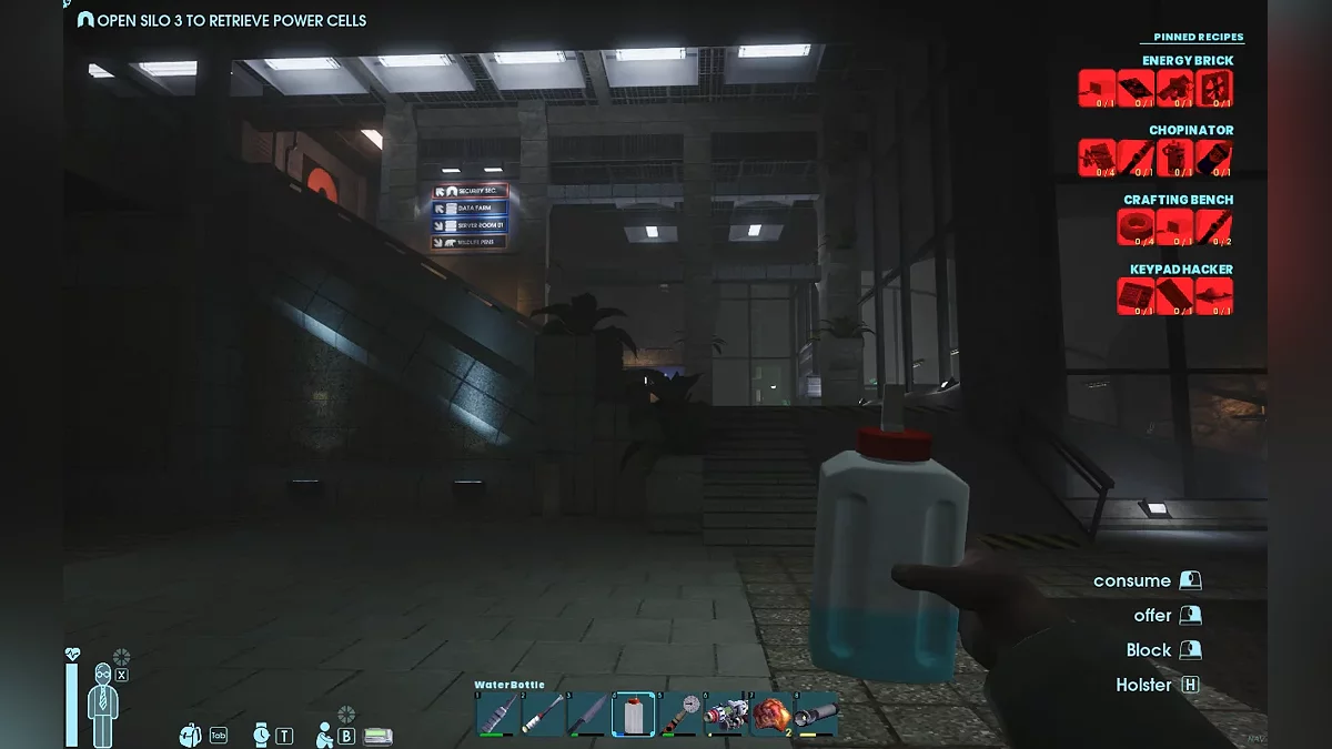Перед лестницей, ведущей к серверной, будет стоять кулер с водой. Там вы можете попить воды и наполнить свою бутылку или кастрюлю, если уже изготовили ее. Осторожно обойдите этаж вокруг охранника, соберите ресурсы и запаситесь провизией.