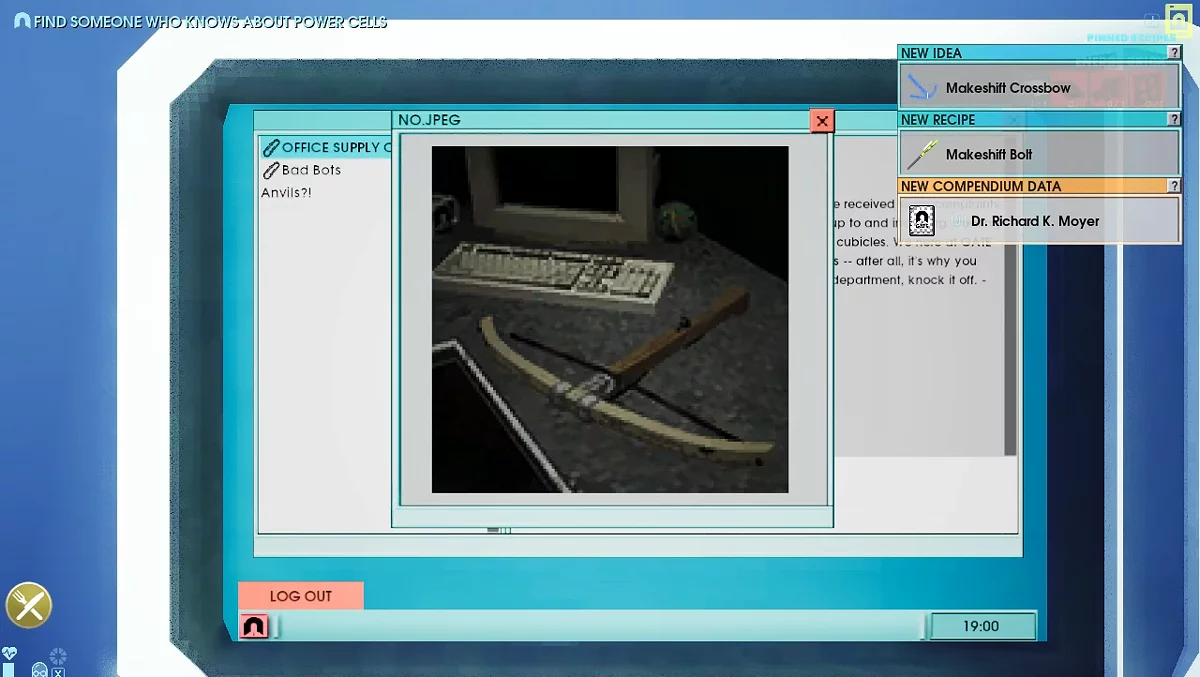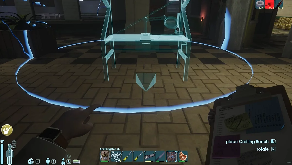 На входе в офис расположена информационная стойка. Открыв фотографии в письмах на компьютере, вы можете разблокировать чертеж арбалета. Кроме того, не забудьте подобрать степлер и настольный телефон. Здесь эти ресурсы будут встречаться довольно часто. Вернитесь к верстаку, чтобы исследовать новые чертежи. В этот момент вскоре как раз должна наступить ночь.