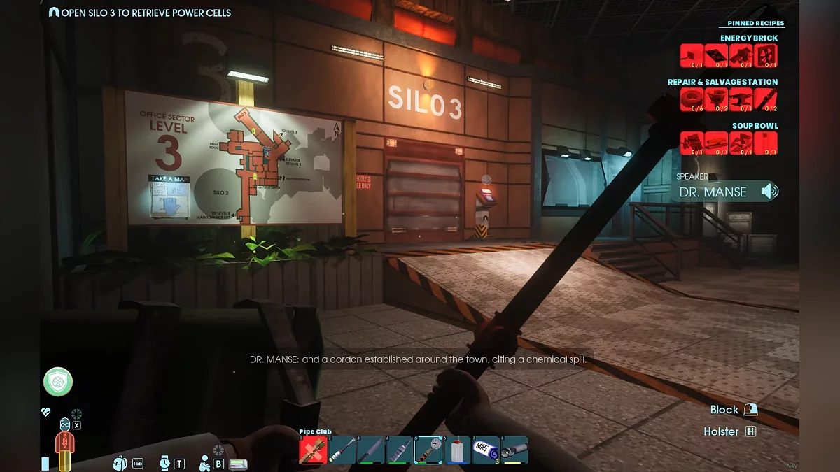 Пройдите мимо карты, а также мимо большой стеклянной двери и офисов по указателю к Бункеру №3. Чтобы открыть её, вам потребуется устройство взлома с уровнем доступа 1-го уровня. Зайдите в соседнюю дверь справа и поговорите с Доктором Мэйлфилд. Она откроет вам соответствующий рецепт, но попросит убить пару роботов-охранников ради материалов. Лифт, расположенный прямо напротив прохода в Бункер №3, приведёт вас к уже исследованной части офиса на втором этаже.