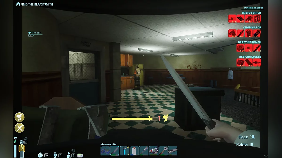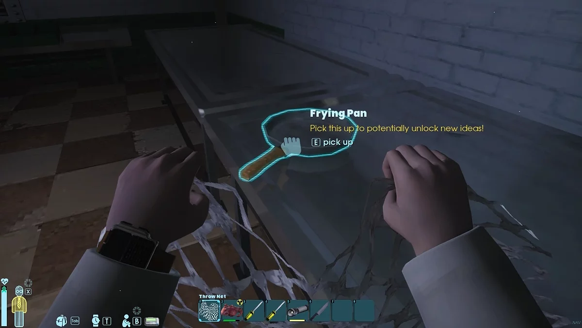 На кухне можно собрать утварь, запастись готовящимся стейком со сковородки и накопить подносы, чтобы чуть позже на верстаке изготовить из них первую броню. Кроме того, позади плиты будет лежать труп, с которого можно подобрать фартук и колпак. А в морозильнике в дальнем углу есть небольшие запасы мороженого, охраняемые жуком.
