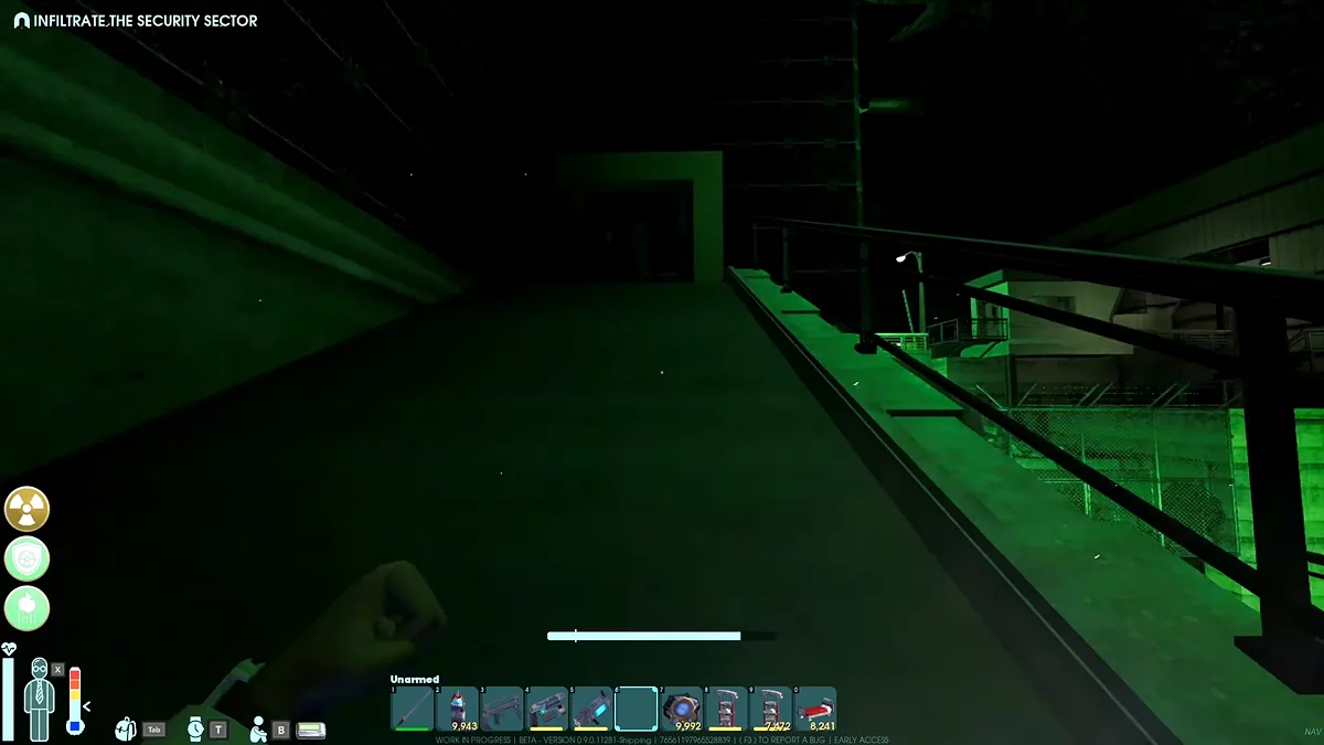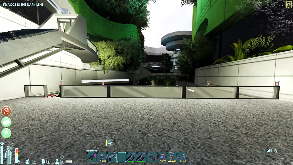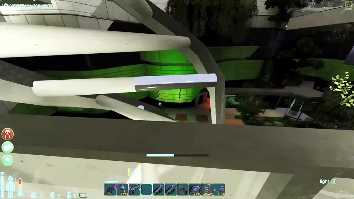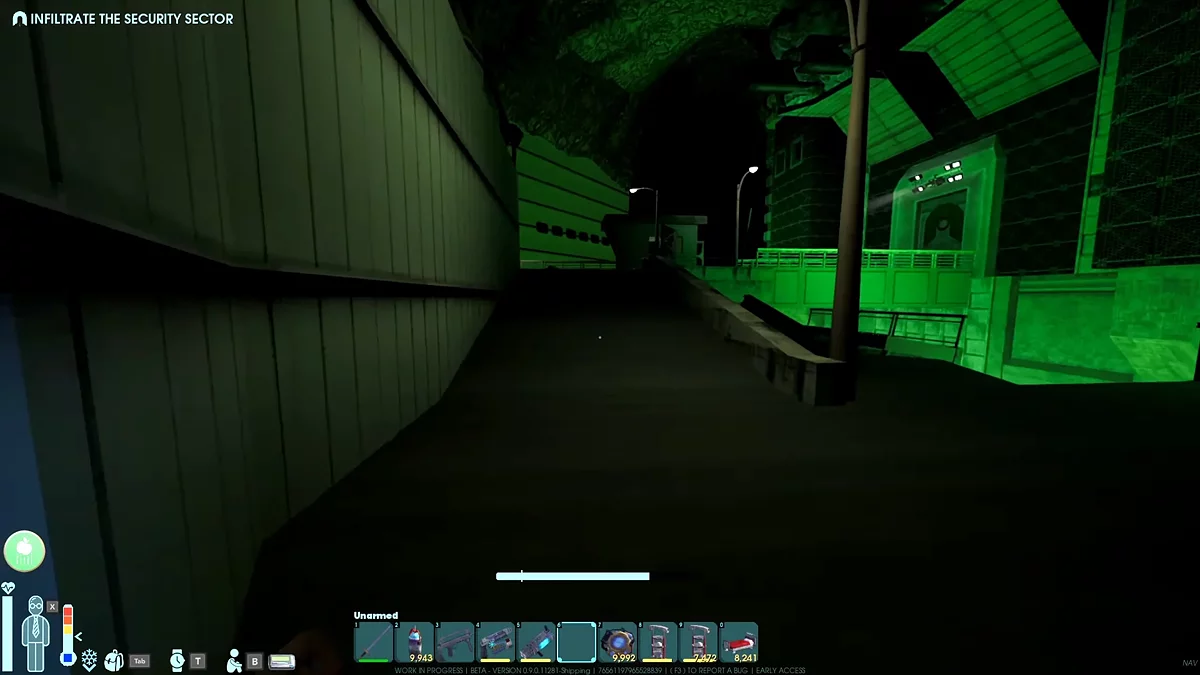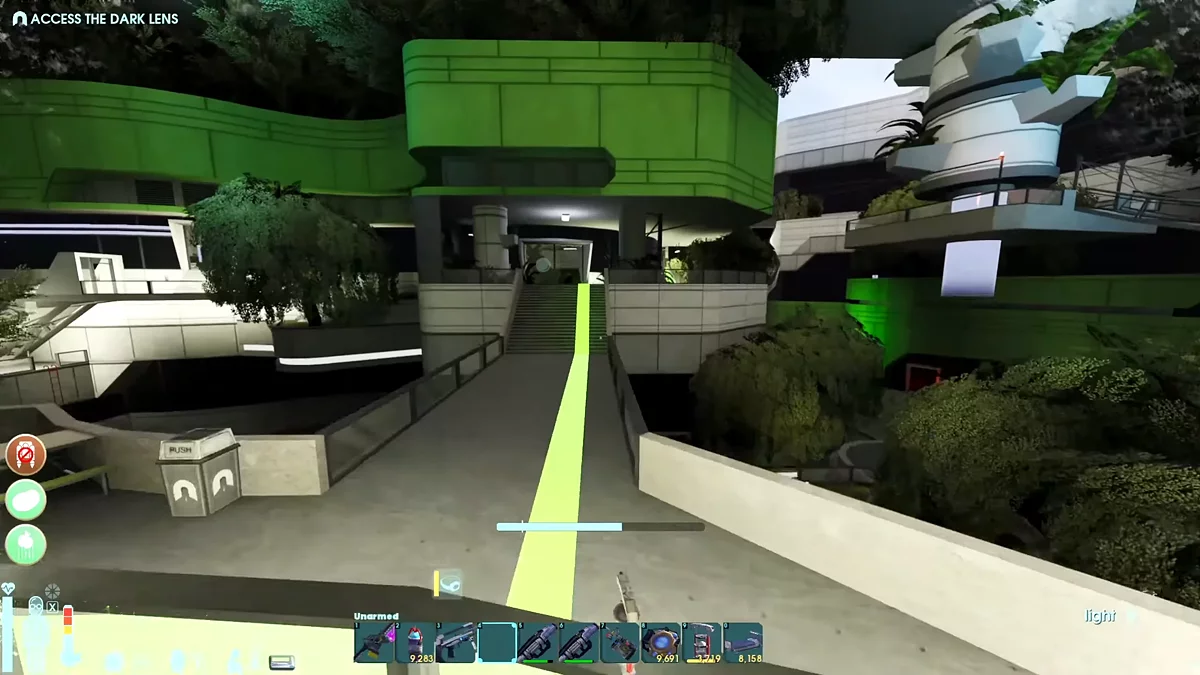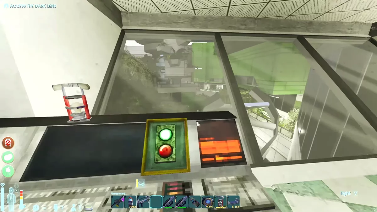 По вентиляционной шахте выберитесь наружу и поднимитесь по лестнице на второй этаж здания. Активируйте кнопку на левой панели управления, вернитесь на улицу и идите вдоль зеленой линии на полу до самого конца.