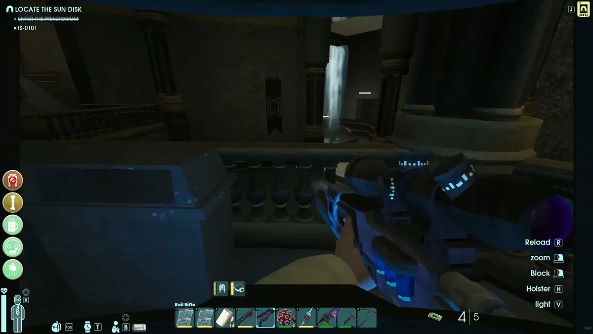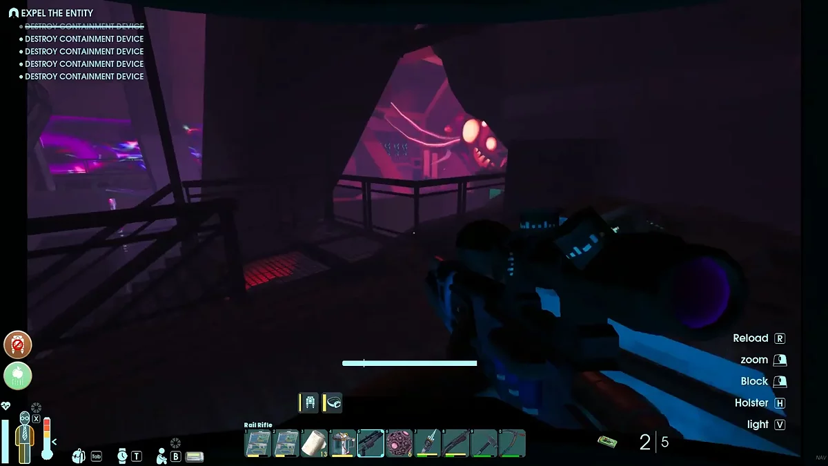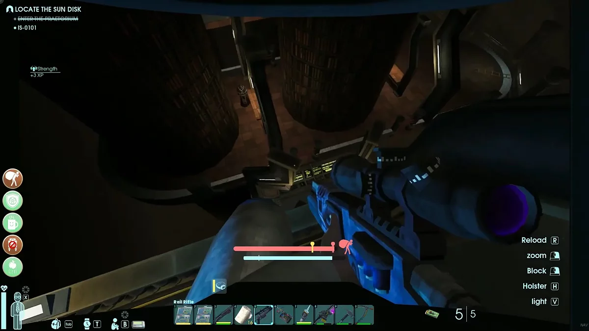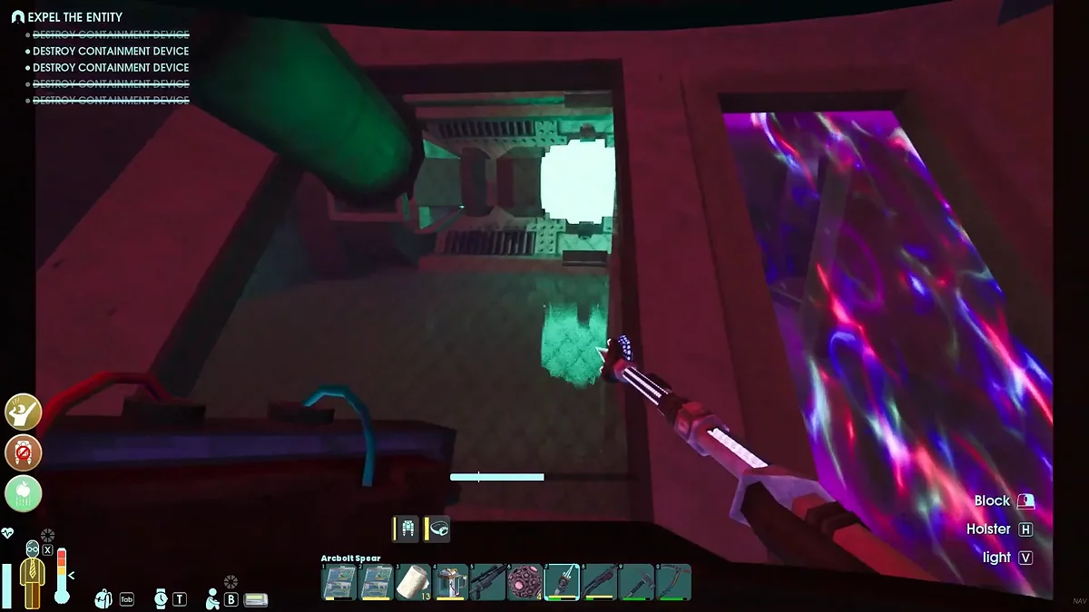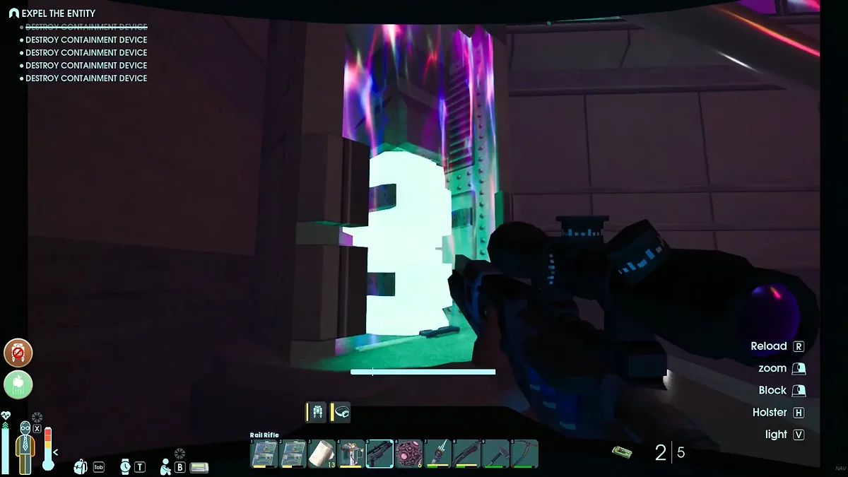 Вернитесь по лестнице на предыдущий этаж. На левом конце платформы будет спуск. Воспользуйтесь им. Если пройти чуть вперед и продолжить пользоваться лестницами, то за углом на последнем этаже будет спрятанное устройство. Разрушьте его защитную оболочку при помощи нулевой гранаты, а затем сотрите сам объект.