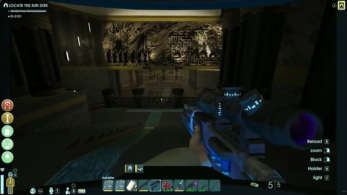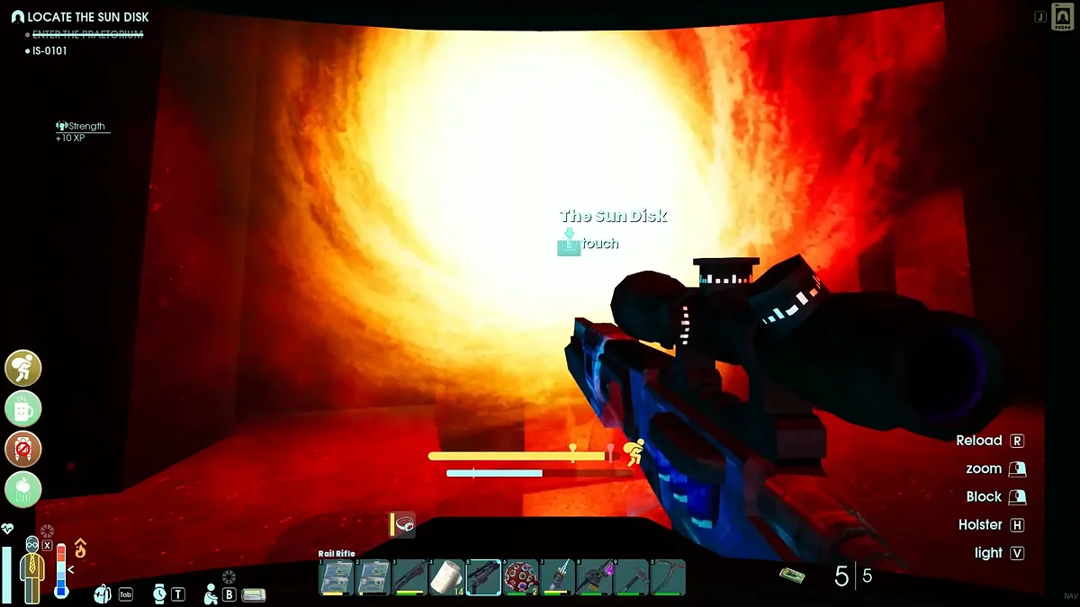 Запрыгните на коробки прямо перед вами, чтобы забраться на платформу. Поднимитесь по лестнице перед вами. Направляйтесь в сторону синей метки. Добравшись до солнечного диска, взаимодействуйте с ним.