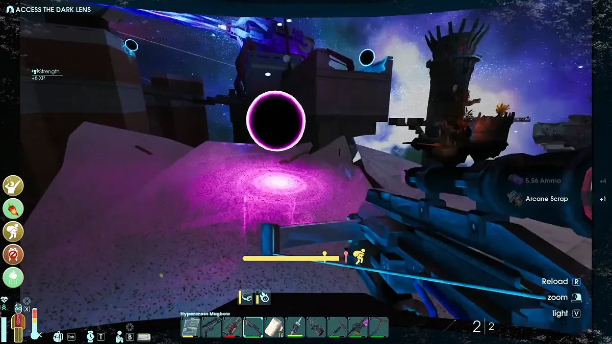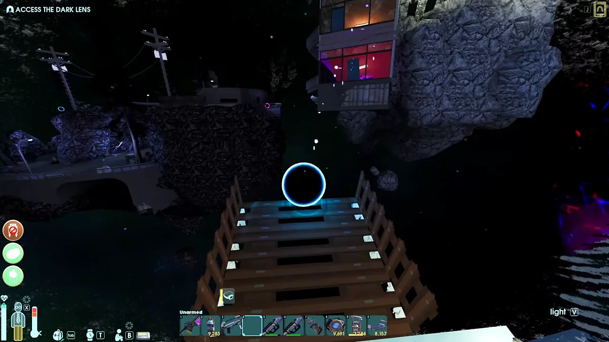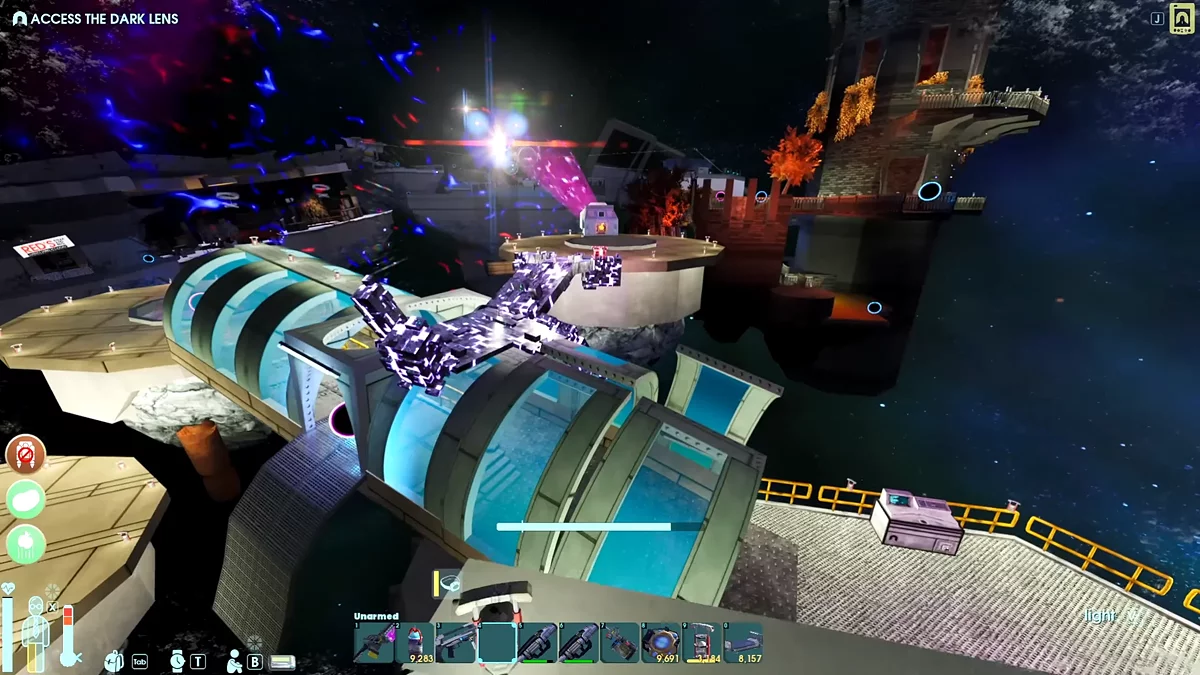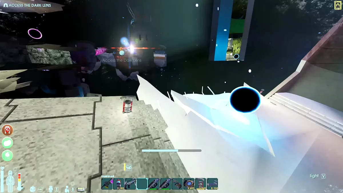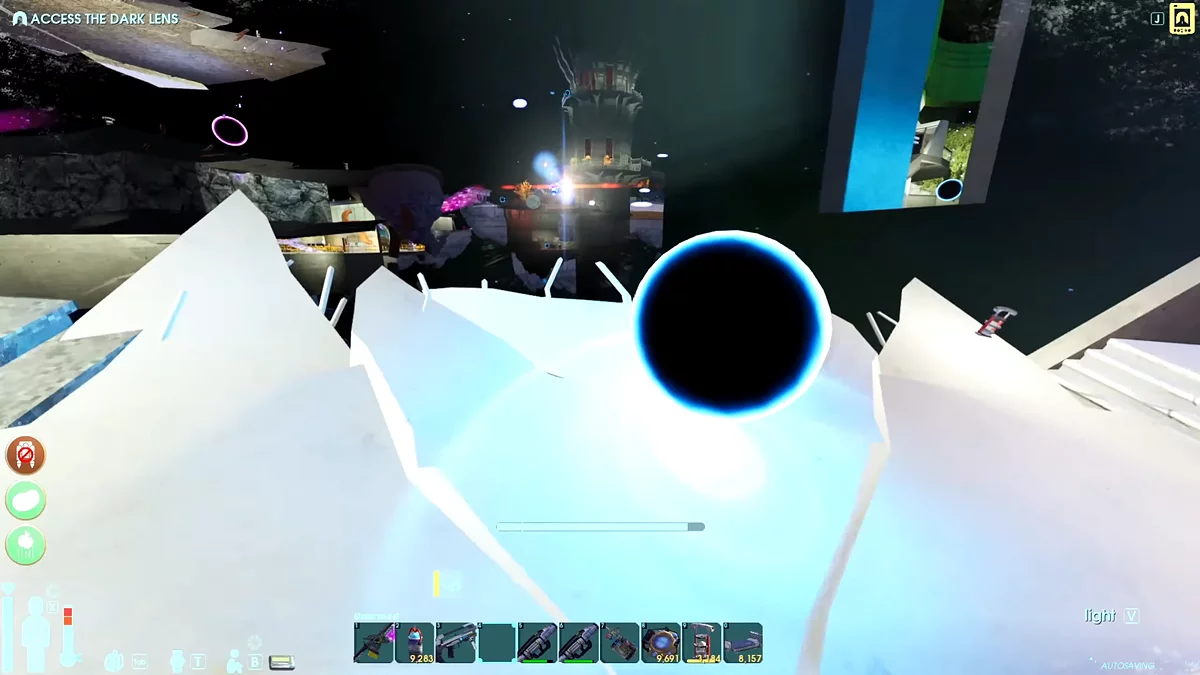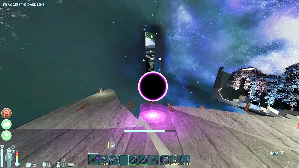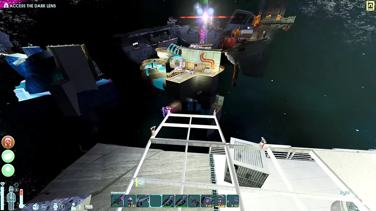 Сначала выберите путь справа. На лестнице воспользуйтесь неизвестным объектом на краю, чтобы прыгнуть еще дальше. Пройдя две платформы, последовательно перелетите от синего объекта к фиолетовому, а затем попадите в небольшое измерение напротив.