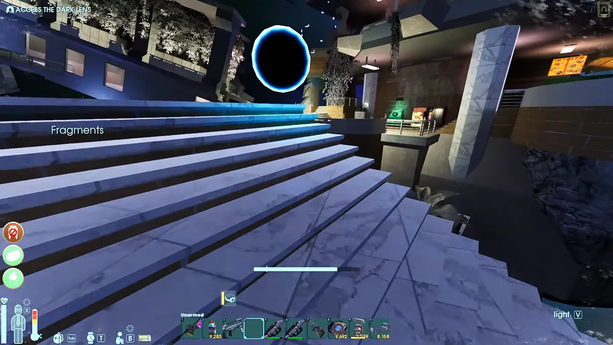 Пройдите через коридор впереди, сразу свернув на лестницу слева на следующем перекрестке. Через балкон помещения на верхнем этаже покиньте здание и следуйте вдоль зеленой световой дорожки. Перед следующей небольшой лестнице вверх нужно спрыгнуть на спиральную конструкцию справа и воспользоваться красным порталом справа снизу.