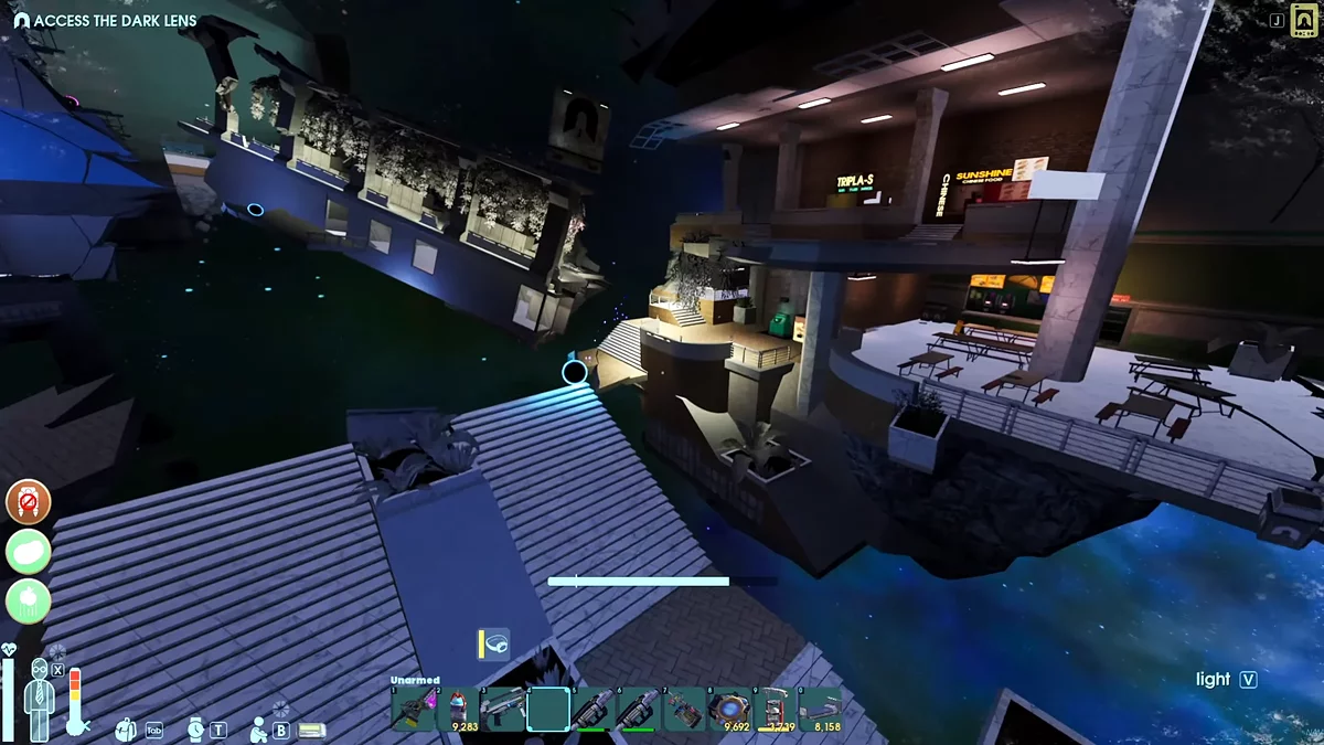 Вернитесь к холлу с небольшим фонтаном. Напротив расположен надземный переход. Дойдите до его середины и спрыгните на платформу с кнопками и датчиками чуть ниже. Сначала приземлитесь на столб, а уже потом на само основание. На развилке сверните направо.