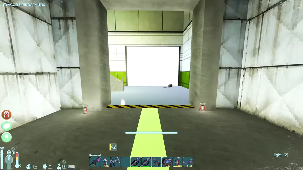 В следующей локации выйдите из помещения через проход напротив точки появления и идите вдоль световой дорожки на полу. Сверните в оконный разъем справа от ворот, к которым ведет линия. Спуститесь в самый низ и проползите через вентиляцию. В следующем помещении будет зеленый портал.