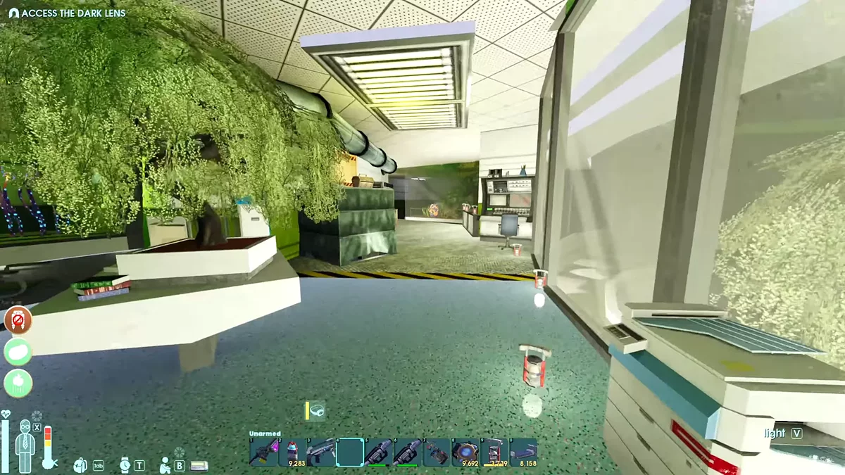 В вентиляции спрыгните вниз. Будете аккуратны, ведь вас может поймать инопланетная ловушка. Устраните сначала ее, а потом жука. За синей дверью расположено хранилище, где можно пополнить запасы ресурсов, найти семена и подсобрать патронов на будущее. А за зеленой дверью находится выход в кафетерий, чтобы вернуться на базу.