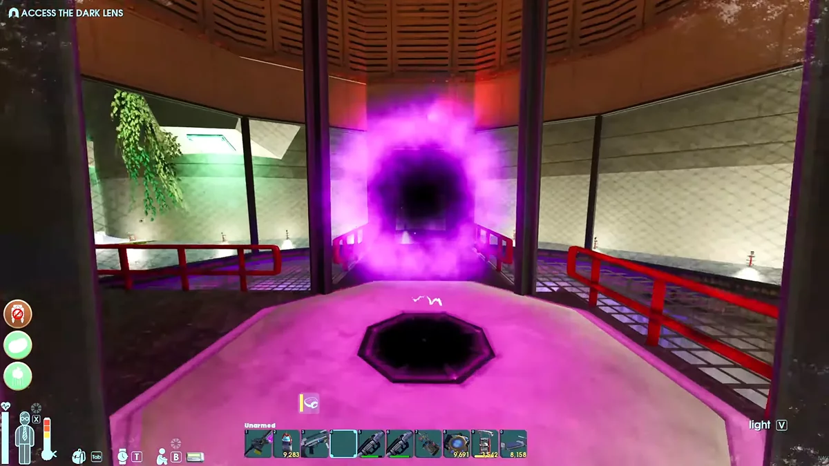 Поднимитесь по такой же спиральной конструкции обратно и зайдите в постройку справа. В конце помещения есть небольшой уголок с растениями. Справа от него активируйте зеленый портал.