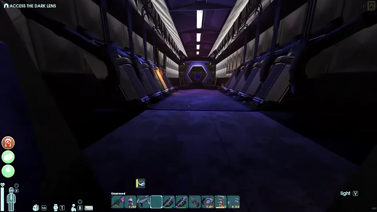 На той стороне пройдите сквозь большую арку и дверь в левом углу. Снова выберите левое направление и зайдите под конструкцию с голограммой. В противоположном от панелей углу есть необычный способ попасть дальше.