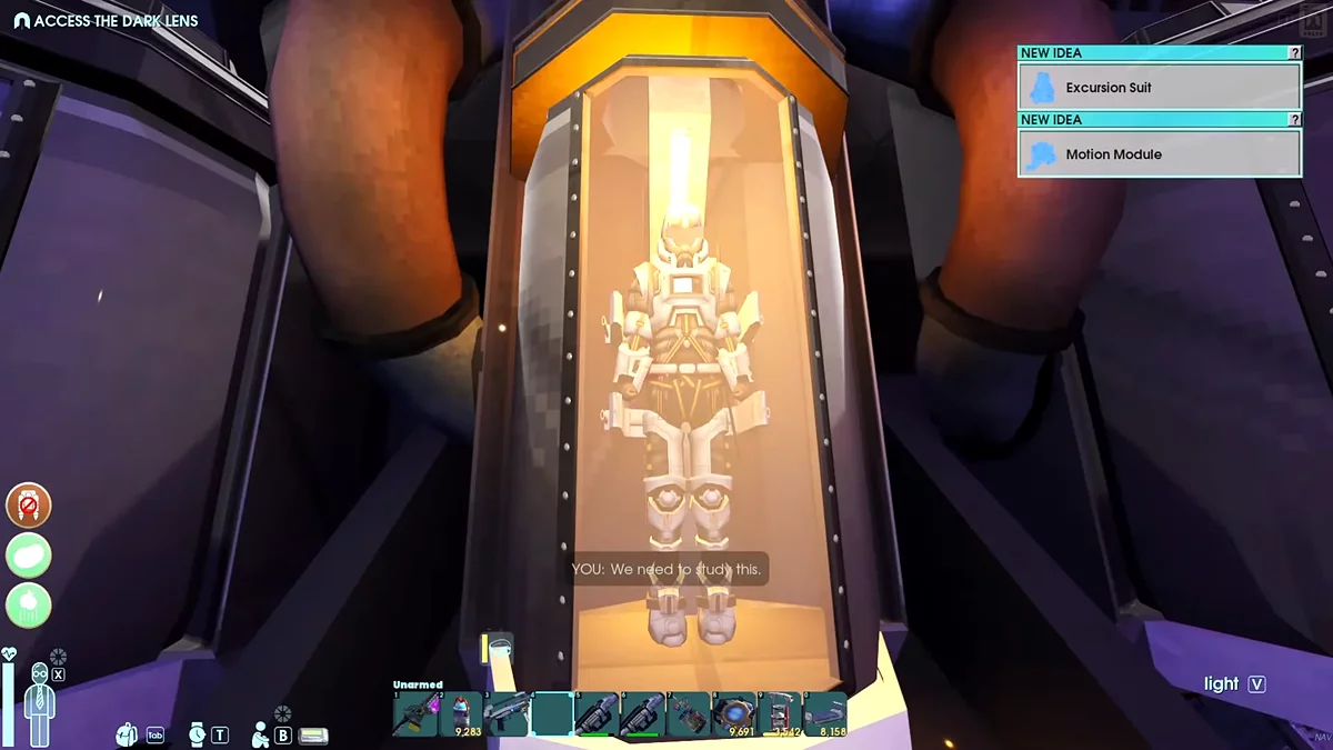 После телепортации вы попадете в странный ангар. Откройте тоннель перед вами по нажатию кнопки. Не пропустите подсвеченную капсулу, в которой можно повзаимодействовать с костюмом, чтобы открыть новые чертежи. Воспользуйтесь порталом в конце тоннеля и в следующем здании сначала прокатитесь на лифте.