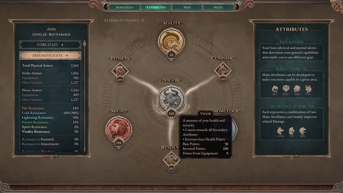 В первую очередь займитесь прокачкой атрибута «Мощь». Это основа для «Земли» и «Войны», поэтому он для вас приоритетный. После этого сконцентрируйтесь на улучшении «Выносливости», чтобы выдерживать как можно больше входящего урона. С ростом «Здоровья» и «Стойкости» вы сможете не акцентировать внимание на выживаемости и зациклиться на растущем уровне.