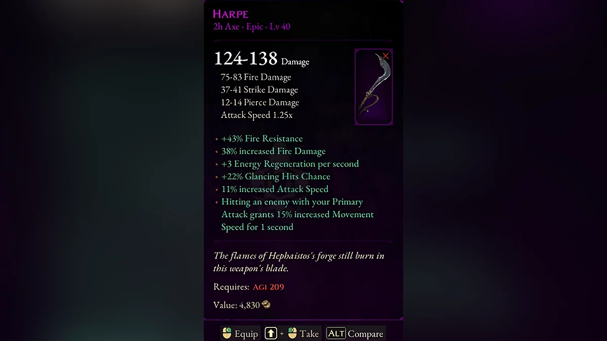 «Харп» подходит под любой стиль геймплея и дает возможность наносить очень большой урон при помощи огненной стихии. Особенно хорошо он проявляет себя в комбинации с «Размашистым ударом». Стоит также отметить, что для владения топором потребуется прокаченная «Ловкость», так что не жалейте очков на данную характеристику. Также «Харп» увеличивает скорость передвижения персонажа за попадание по врагу, поэтому этот предмет идеально подходит под данную сборку.
