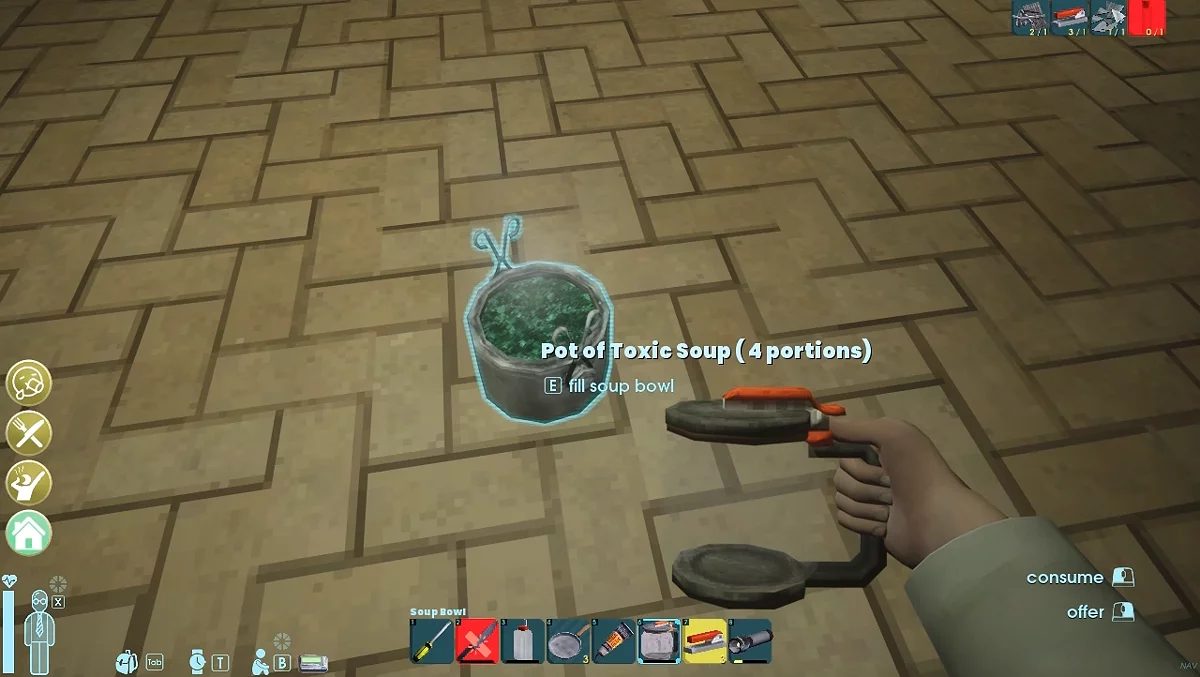 - Ядовитый суп можно получить, если добавить в кастрюлю совсем несъедобные ингредиенты. Он вызовет тошноту, рвоту и дебаффы;