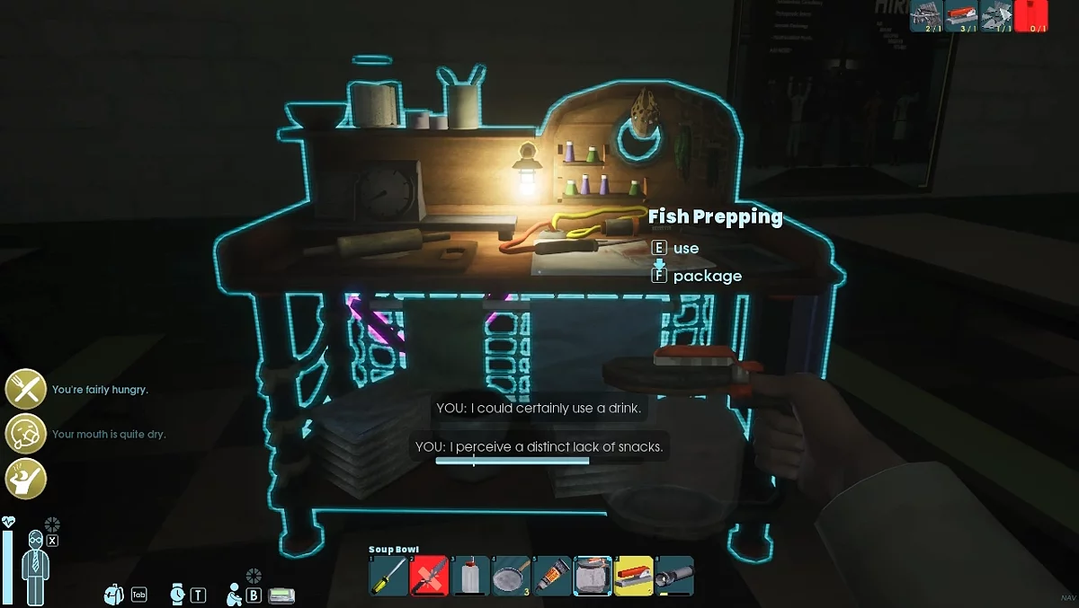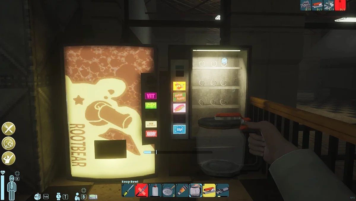 В первые минуты вы можете приобрести сладости и напитки в торговых автоматах. К сожалению, эти вкусняшки будут лишь ненадолго притуплять чувство голода. Кроме того, на кухнях различных локаций вы найдете кофемашины и оборудование для изготовления слаша. Они спасут от холода и жары соответственно.