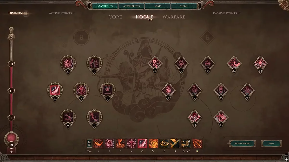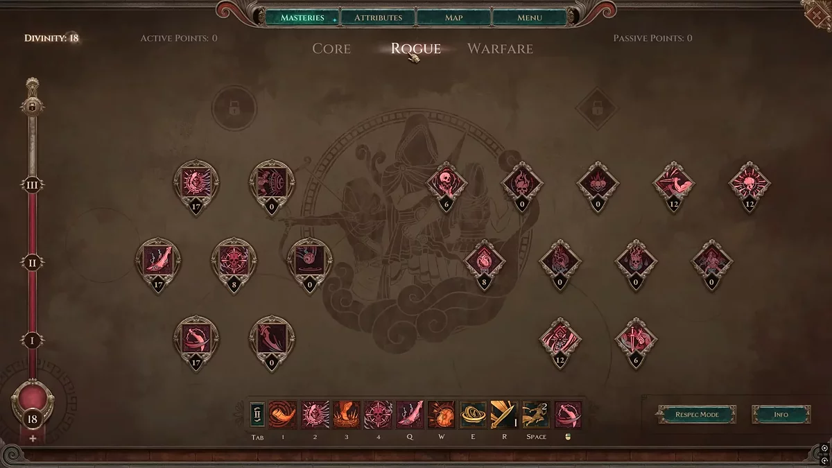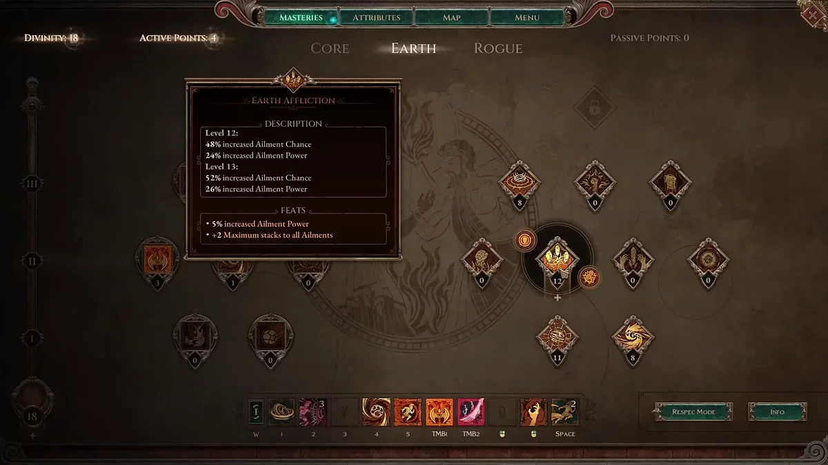 В Titan Quest 2 каждая ветка прогрессии имеет отдельную «шкалу Божественности». Для пепельного воина с «Мерцающим ударом» нужно выбрать «Землю», а затем «Разбойника».