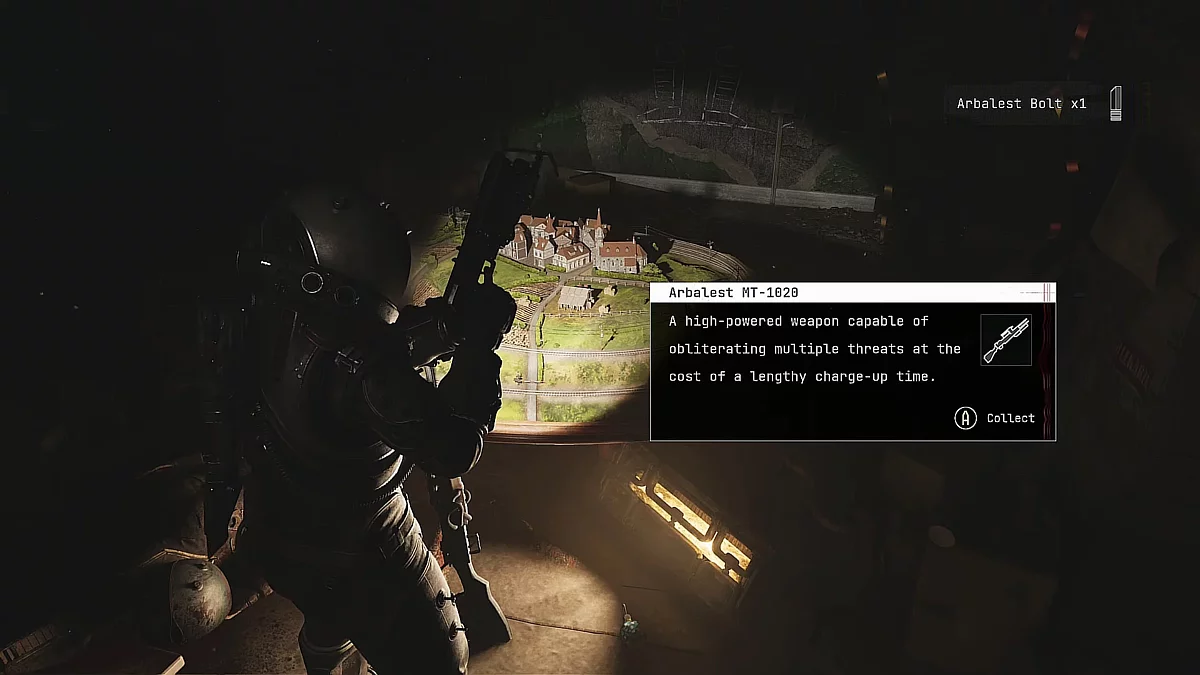 Область, в которой находится Арбалет MT-1020, станет доступна для посещения после победы над боссом в Госпитале (Hospital). По возвращении в хаб вам поручат отправиться в Аббатство (Abbey) на поезде. Не торопитесь с отправкой, сперва нужно посетить локацию, где лежит пушка.