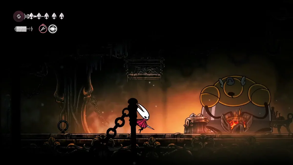 Справа будет локация с мини-боссом, поэтому сначала спуститесь чуть ниже и следуйте по указателю зайдите в комнату. Здесь будет скамейка, новый персонаж Гриндл и метательный расходник «Прямая булавка». Теперь можно вернуться и будет мини-босса, ударив пару раз и закидав его булавками. В награду откроется проход в локацию «Путь охотника».