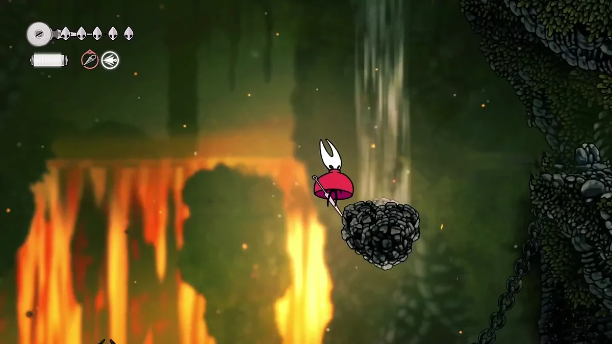 - Тянет нить вниз, после чего на игрока падает колокольчик. Многие из них будут пружинить несколько раз. После того, как место Хорнет зафиксируется, можно подходить и бить врага;
