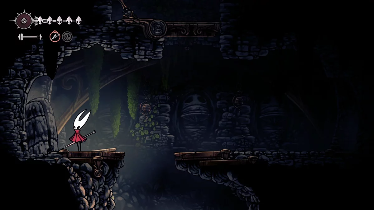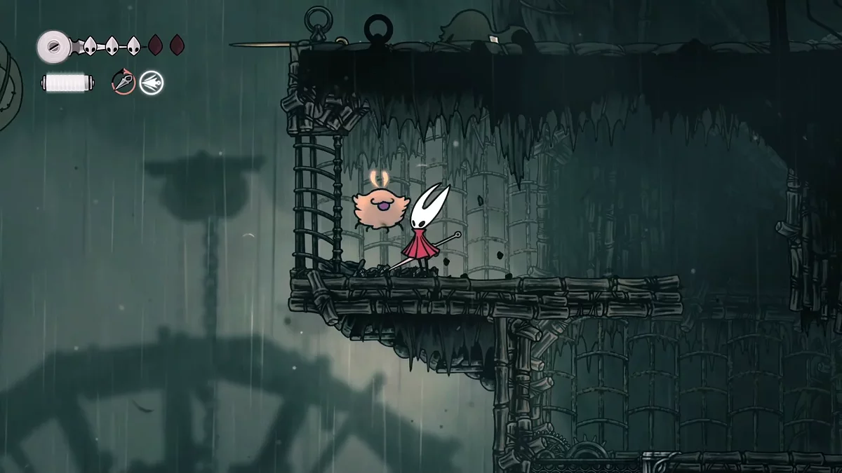 У тотема можно открыть рывок. Помимо стандартного уклонения, можно удерживать кнопку, чтобы Хорнет начала бежать. Продолжайте движение налево, прыгая по платформам. Активируйте рычаг и заберитесь выше. Здесь скована блоха (3/5). Спрыгнув, нажмите ещё один рычаг, для открытия ворот.