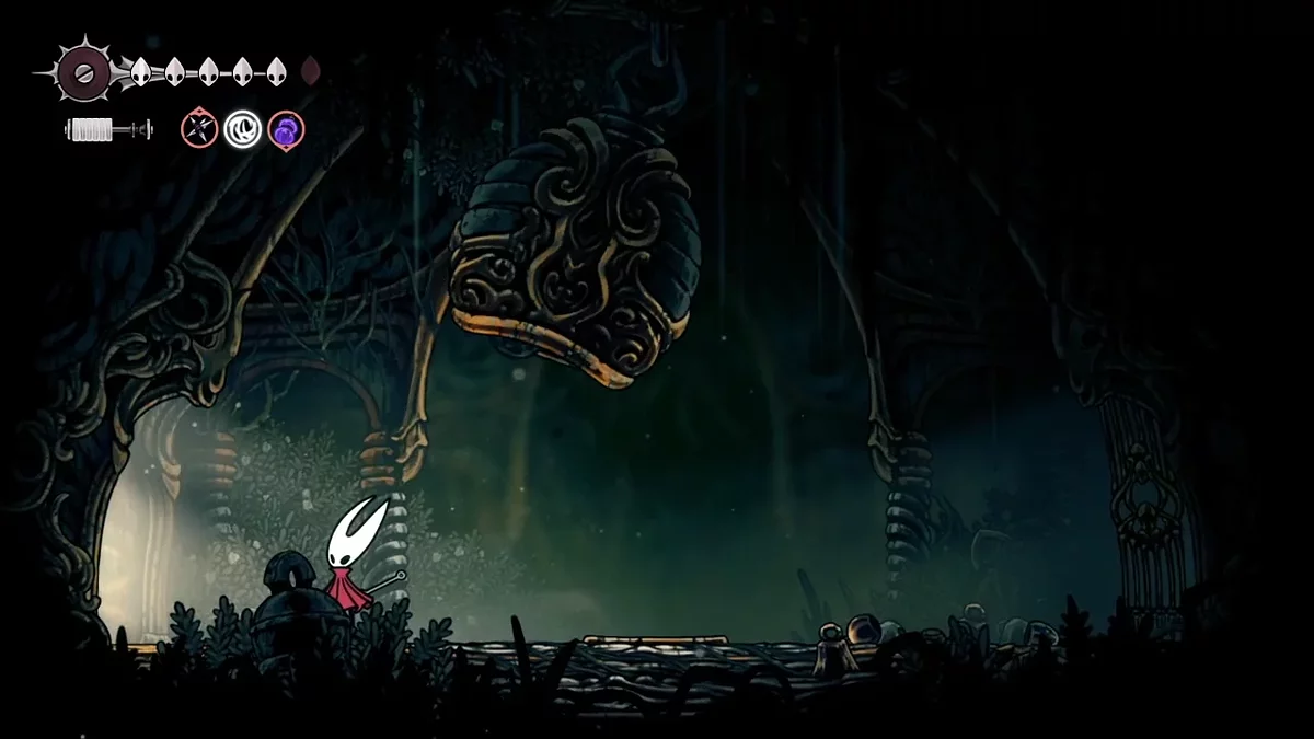 Победив зверя, откроется способность «Шёлковое сердце» позволяющее пассивно восстанавливать шёлк, а также быстрое перемещение между определенными местами. Идите налево и спрыгивает с уступа, чтобы вернуться в лагерь. Зайдя в здание, можно активировать вокзал. Ещё в лагере построили доску заданий, обязательно возьмите все, что доступно. Используя вокзал, отправляйтесь в Костяк. Двигайтесь далее и нажмите на рычаг, чтобы активировать колокол и проход в новую локацию. Ещё чуть дальше будет рычаг, открывающий срез вниз. Поднимитесь наверх через платформы. В конце будет запутанная в корнях блоха (1/5).