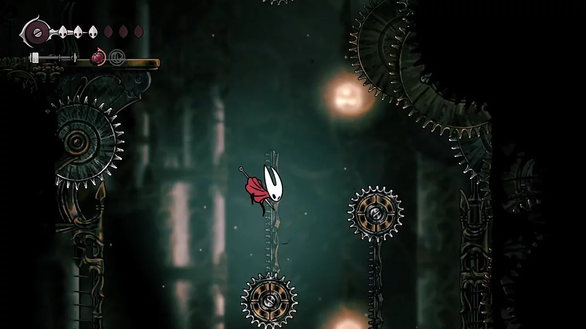 Поверните рычаг, чтобы открыть срезку и повисните на следующем кольце. Вас ждёт вертикальная комната со множеством опасных механизмов. Особых срезок тут нет, придётся проходить самостоятельно, используя Цепкую нить и отскок от стен. Стоит помнить, что бросок Иглы требует шёлк, а значит восстанавливаться на этом пути будет практически невозможно.