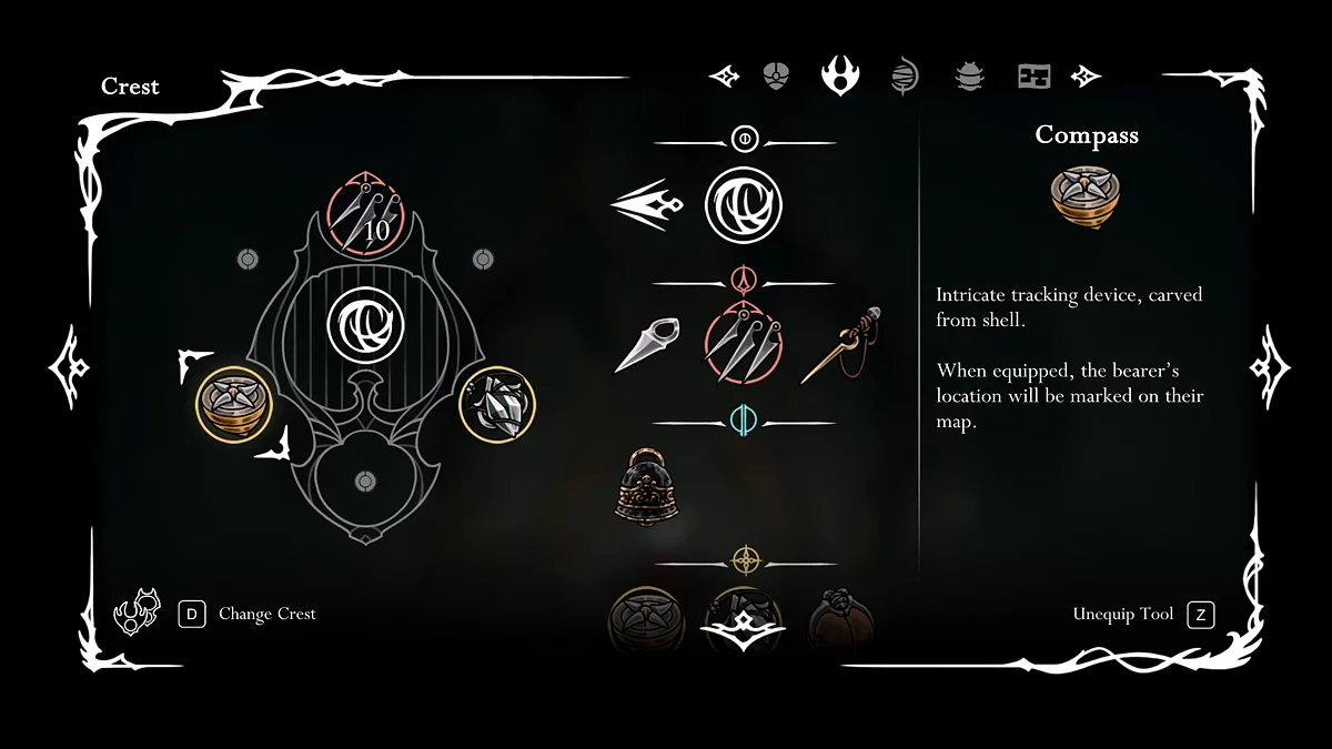 Также Хорнет понадобятся инструменты, что можно отыскать в открытом мире или покупать у торговцев за бусы. Чтобы их использовать, героине нужно носить различные «Знаки» (Crests), в которые можно размещать приспособления, улучшающие какую-либо характеристику или дающие определенный эффект.