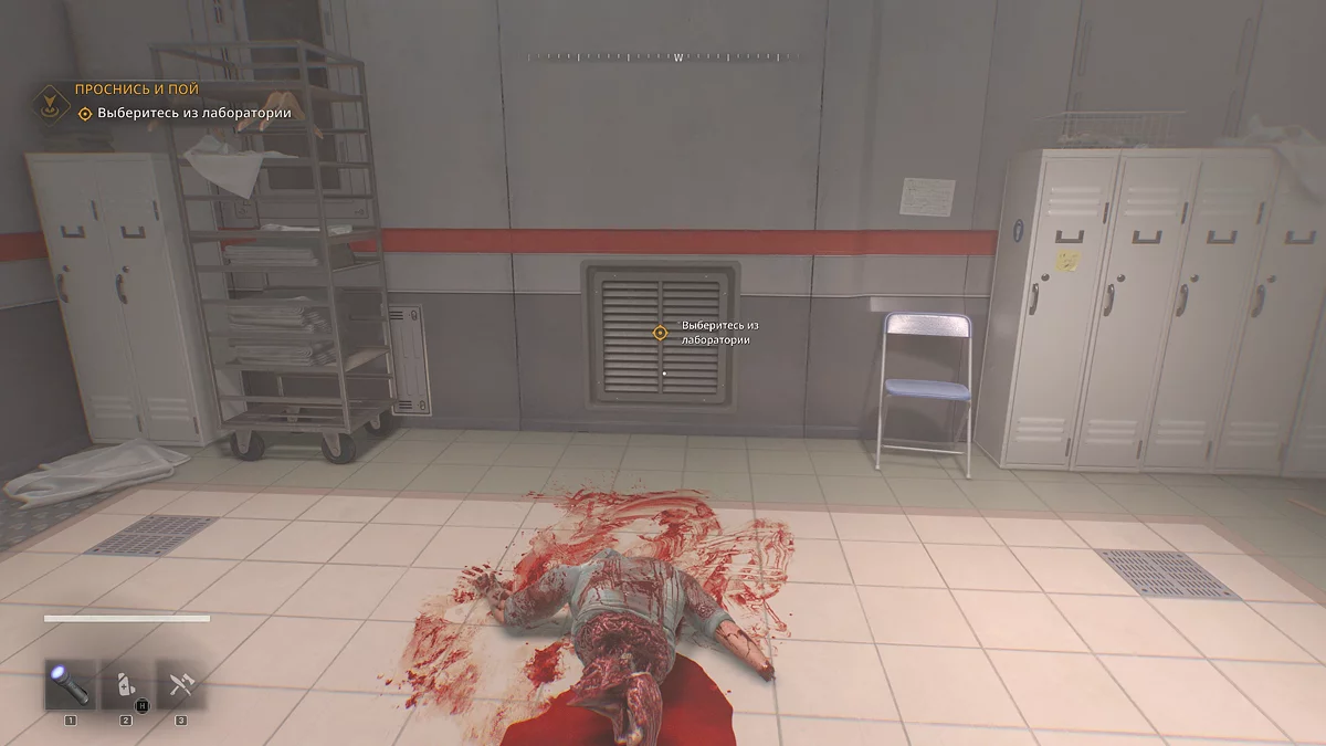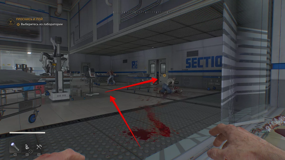 Теперь посмотрите в сторону выхода. У вас на пути пара зараженных, первого обойдите слева, и второго справа, таким образом вы покинете главную операционную незамеченным. Учтите, что если вас обнаружат, нападут бегуны, быстрые и опасные зараженные, поэтому попытайте отступить в вентиляционную шахту.