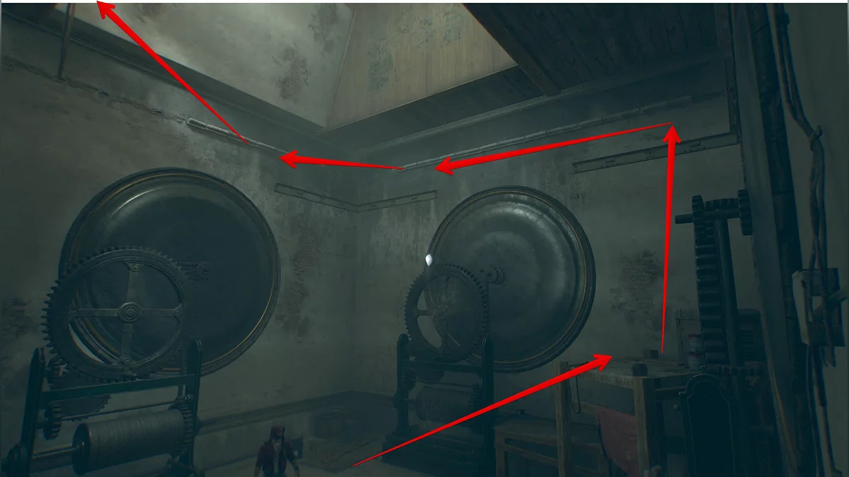 Войдите в колокольню. Отыщите две металлические балки и заберитесь на них. С помощью перекладины прыгайте на другую сторону и ползите наверх.