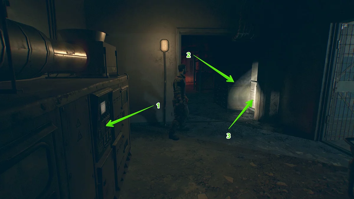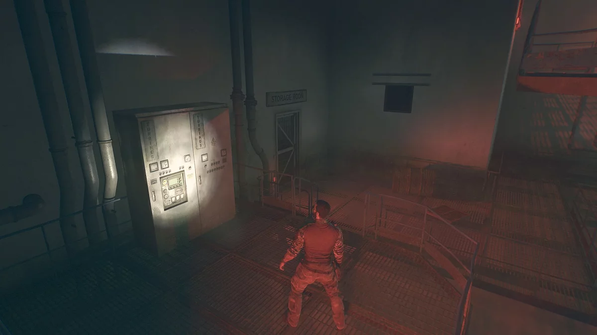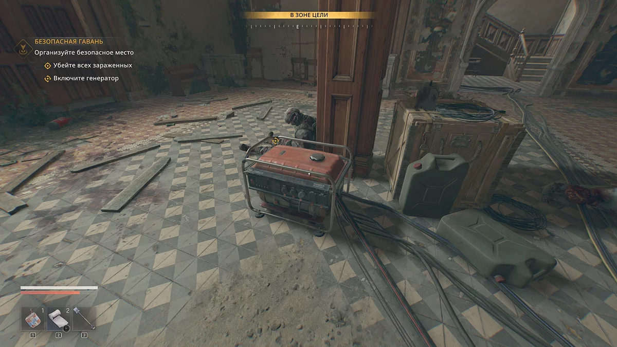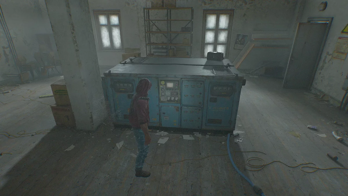 Чтобы запустить генератор, нужно следовать вдоль кабелей, которые идут от него, и повернуть рубильники. Сперва выйдете в зал и по-тихому снимете троих зараженных, а затем закройте входную дверь и запустите генератор.