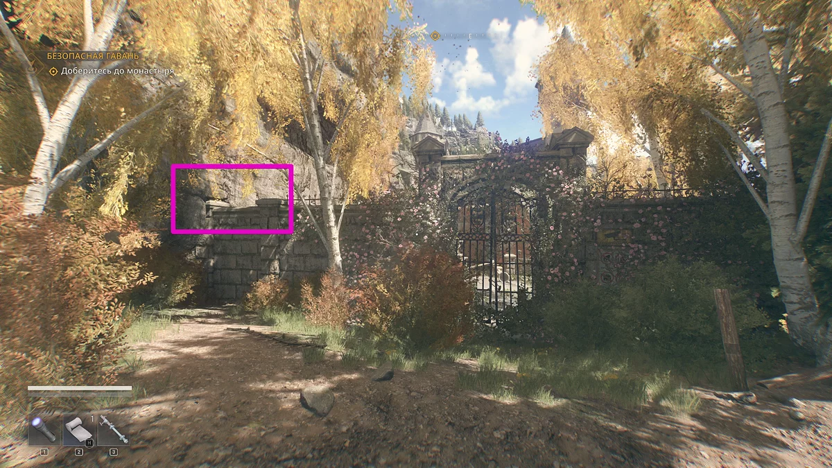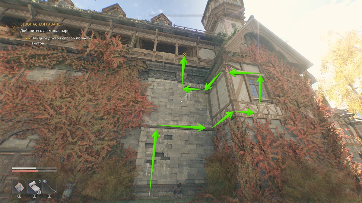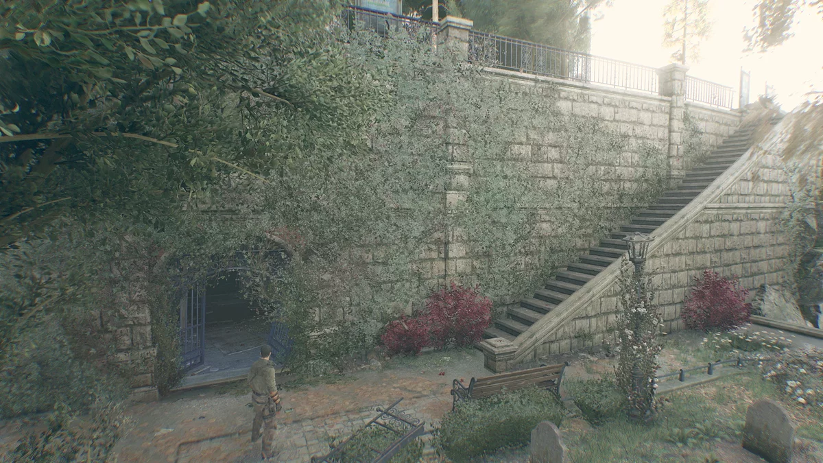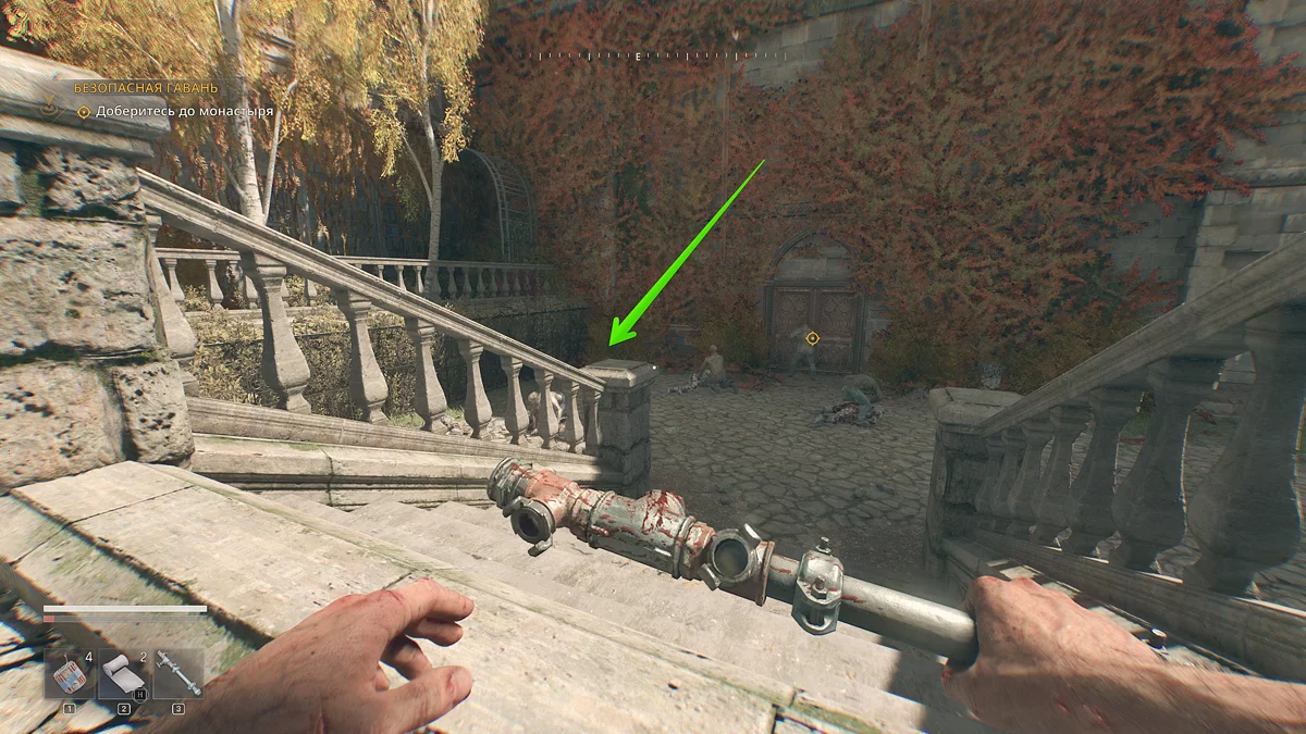 Следуйте по тропинке прямо. Сперва вы встретите заражённого у беседки, затем водопад и каменную лестницу, ведущую вниз, которая приведёт вас к монастырским воротам. Чтобы через них перебраться, посмотрите налево и немного наверх.