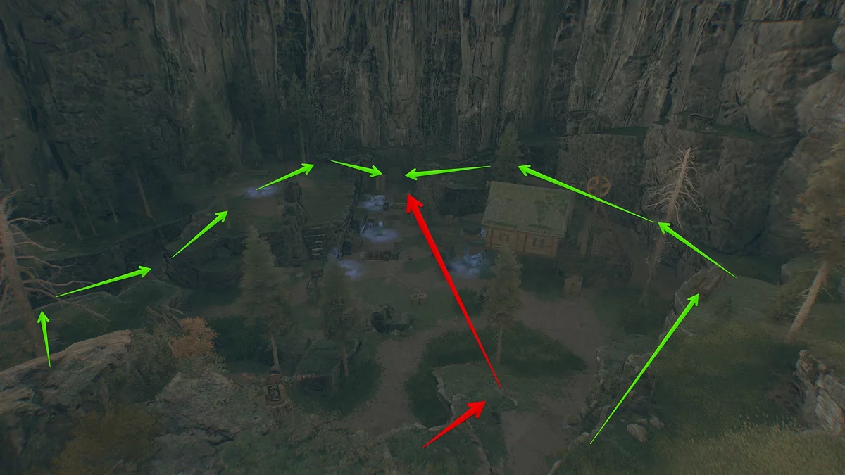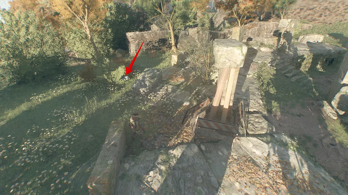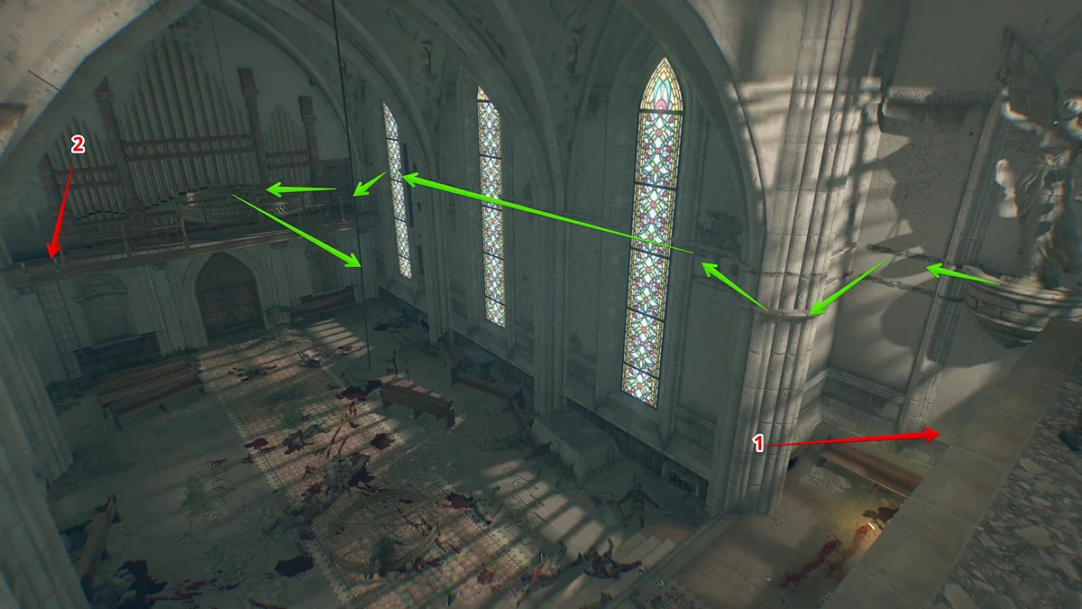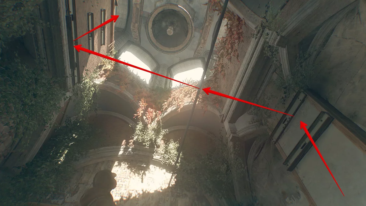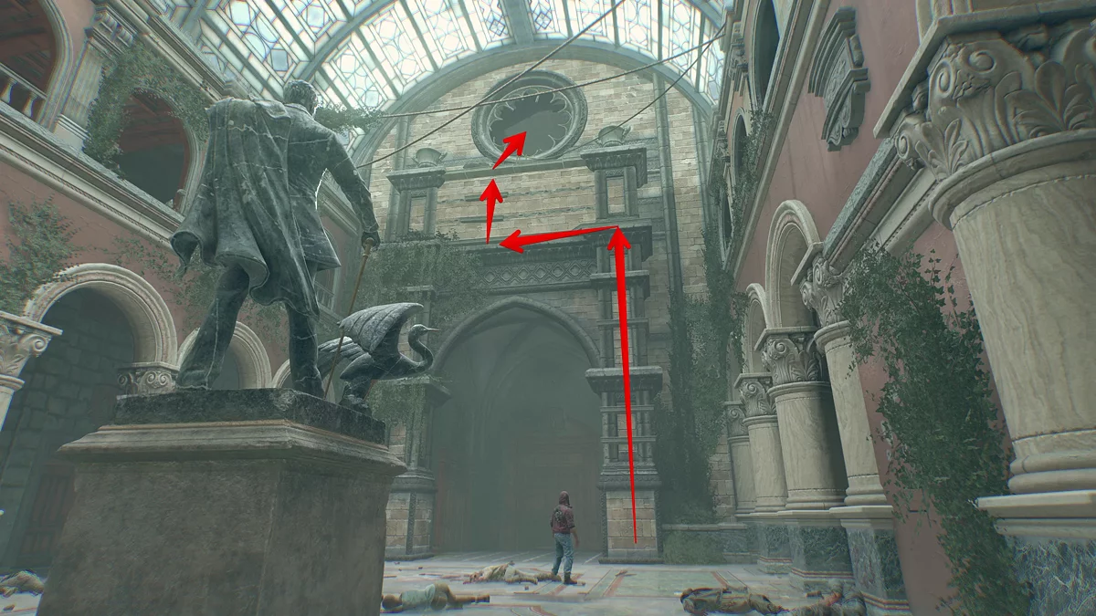 Следуйте по тропинке прямо. Сперва вы встретите заражённого у беседки, затем водопад и каменную лестницу, ведущую вниз, которая приведёт вас к монастырским воротам. Чтобы через них перебраться, посмотрите налево и немного наверх.