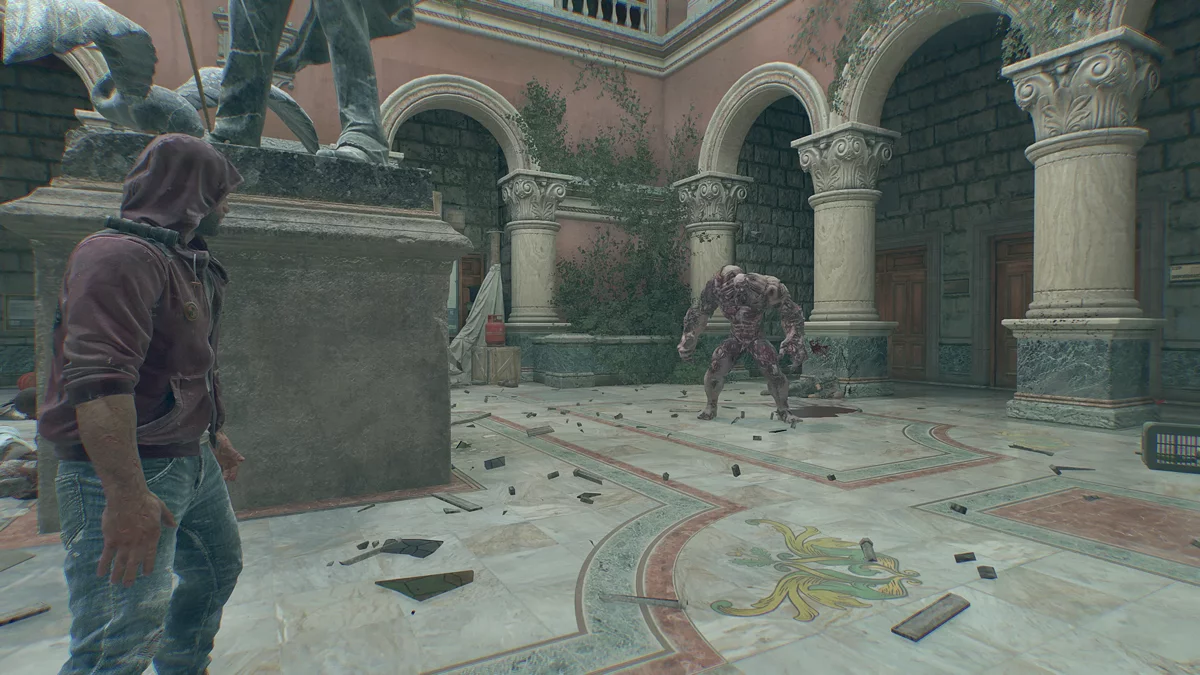 Войдя в ратушу и подберите пистолет — своё первое огнестрельное оружие. Помните, что зараженных привлекает шум, поэтому приберегите его для людей или используйте только в крайних ситуациях. Уберите по-тихому пару врагов и войдите во внутренний двор, который нужно зачистить от десятка противников.