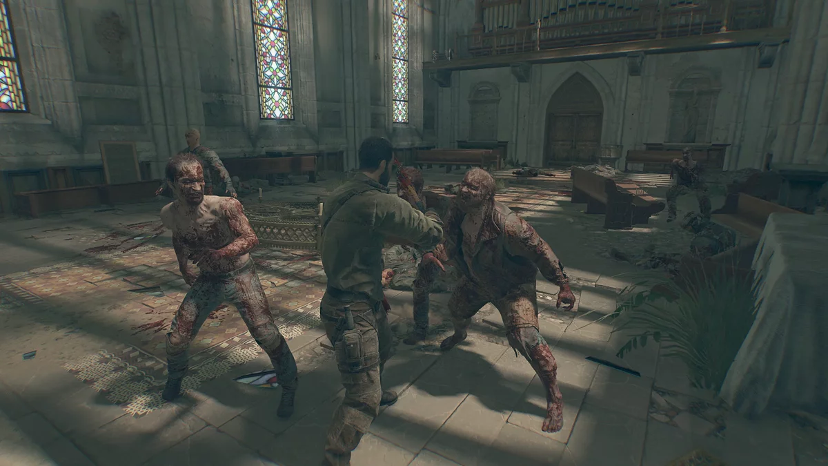 Как только окажетесь на территории монастыря, на вас нападет зараженный, разделайтесь с ним. Подберите рядом со статуей под куполом приманку, потому что впереди встретите скопление инфицированных у двери. Бросайте бомбочки в угол слева от двери и бегите направо.