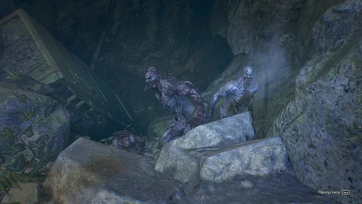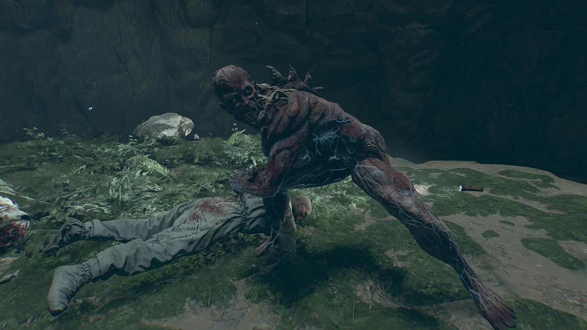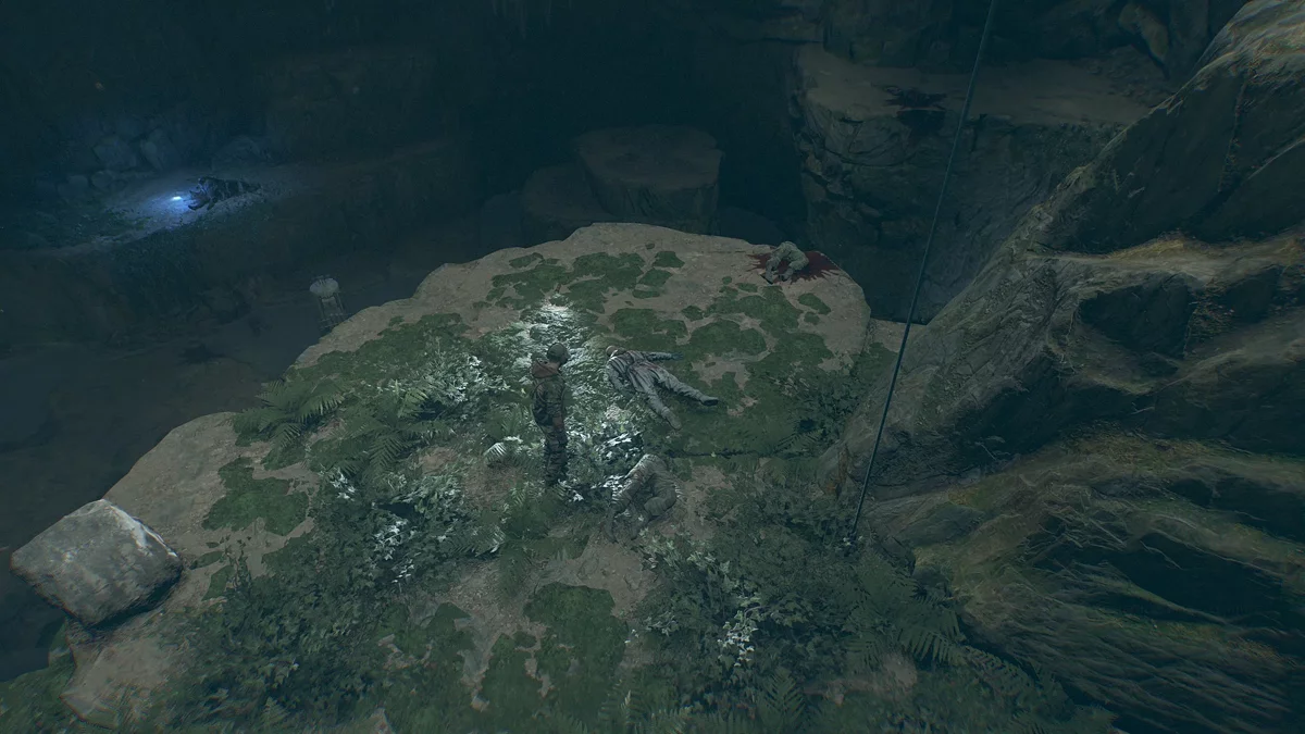 Заберитесь в пещеру. Пройдите мимо зараженных, не привлекая внимания, и поднимайтесь на уровень выше. Продвигайтесь вперёд, пока не увидите синий трос, ведущий вниз. Осмотрите тело ученого, после чего начнется битва с боссом.
