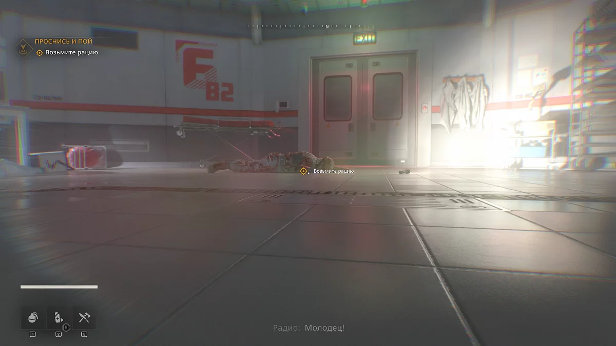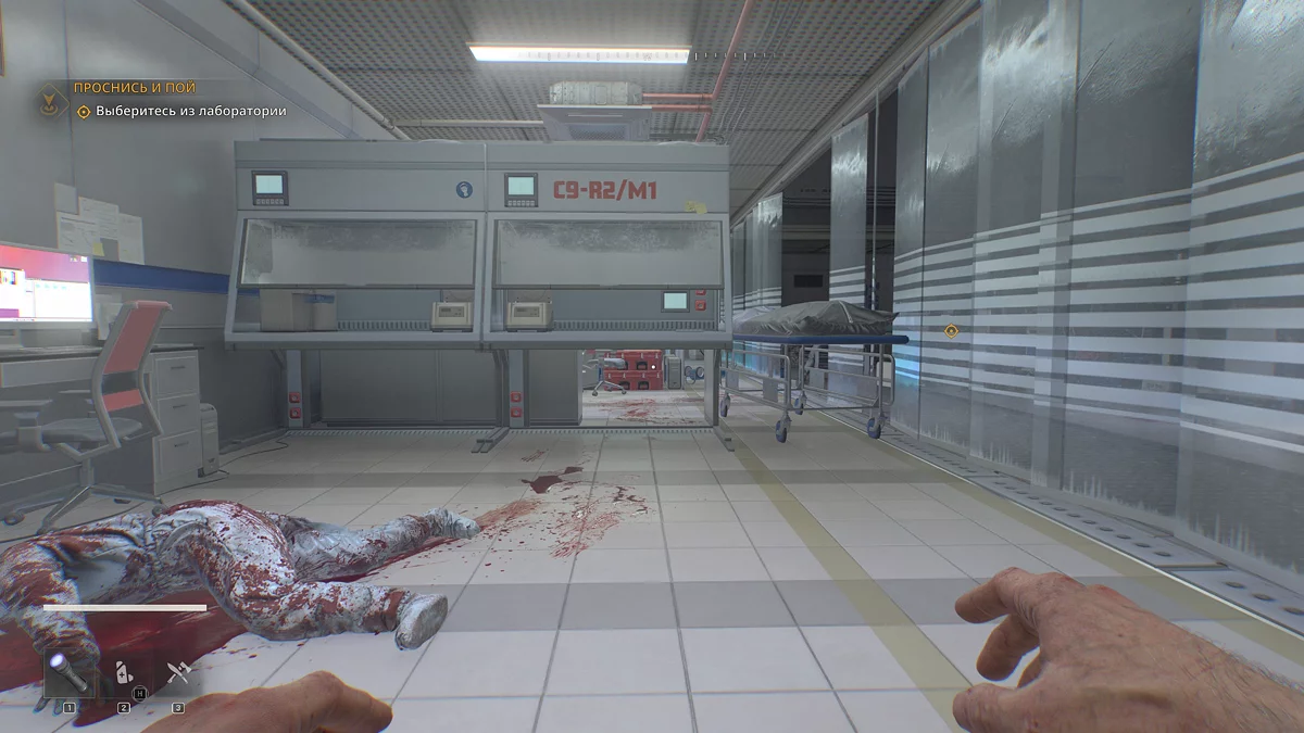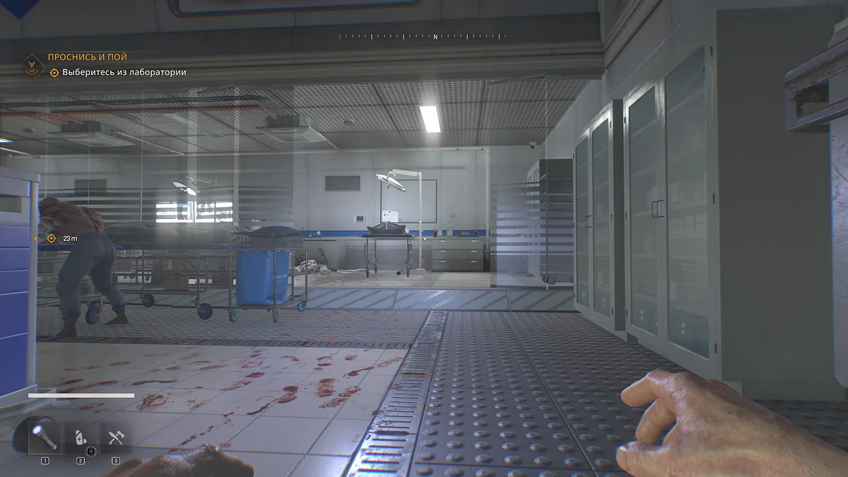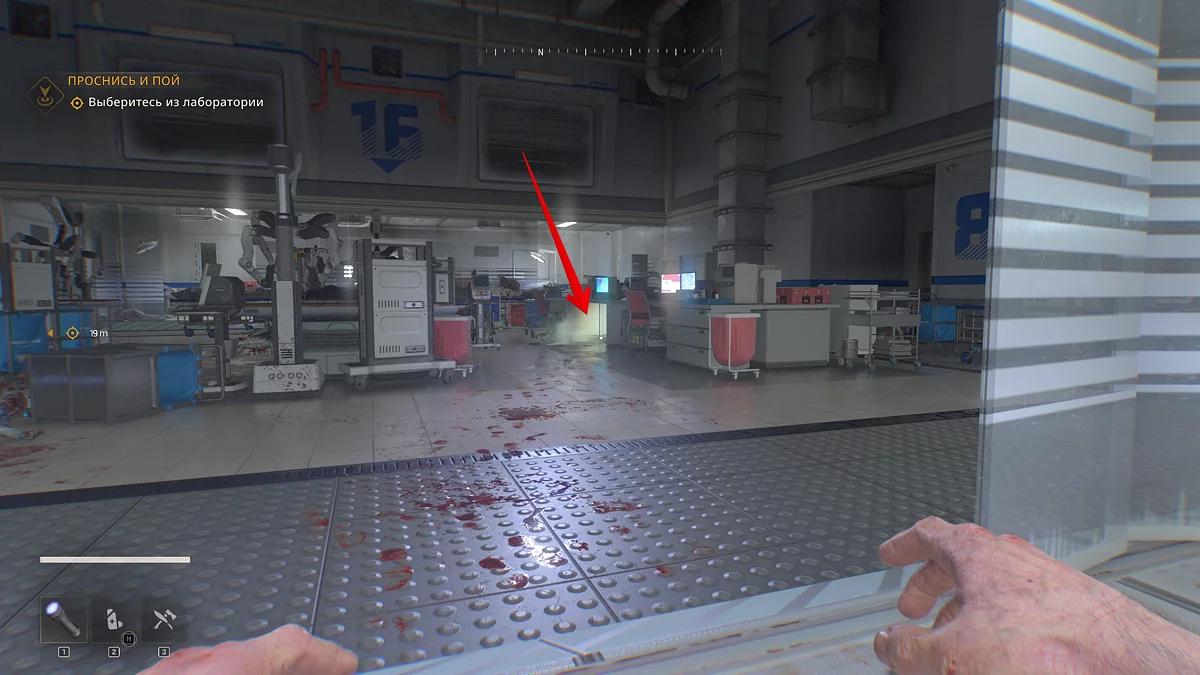 Покиньте вентиляцию, из которой вы попадете в послеоперационную. Ползите к двери и продолжайте движение по коридору направо. В конце поверните налево и посмотрите на тележку с желтыми склянками — там лежит адреналин, с помощью которого Кайл встанет на ноги.
