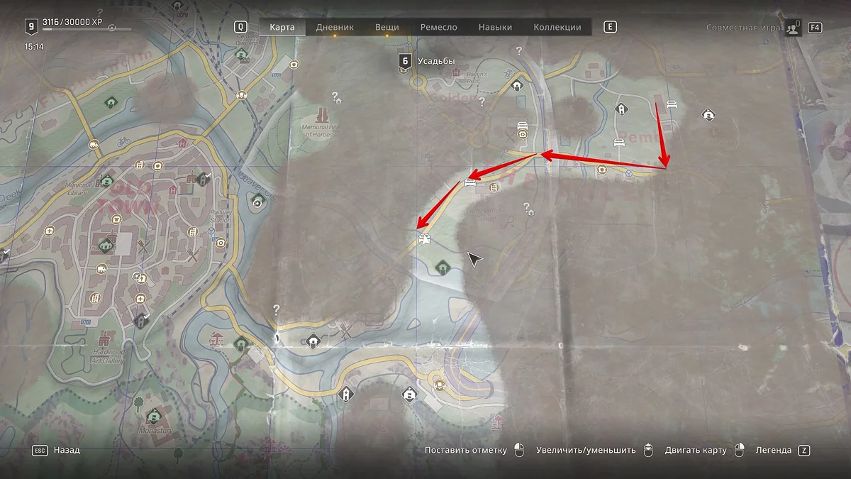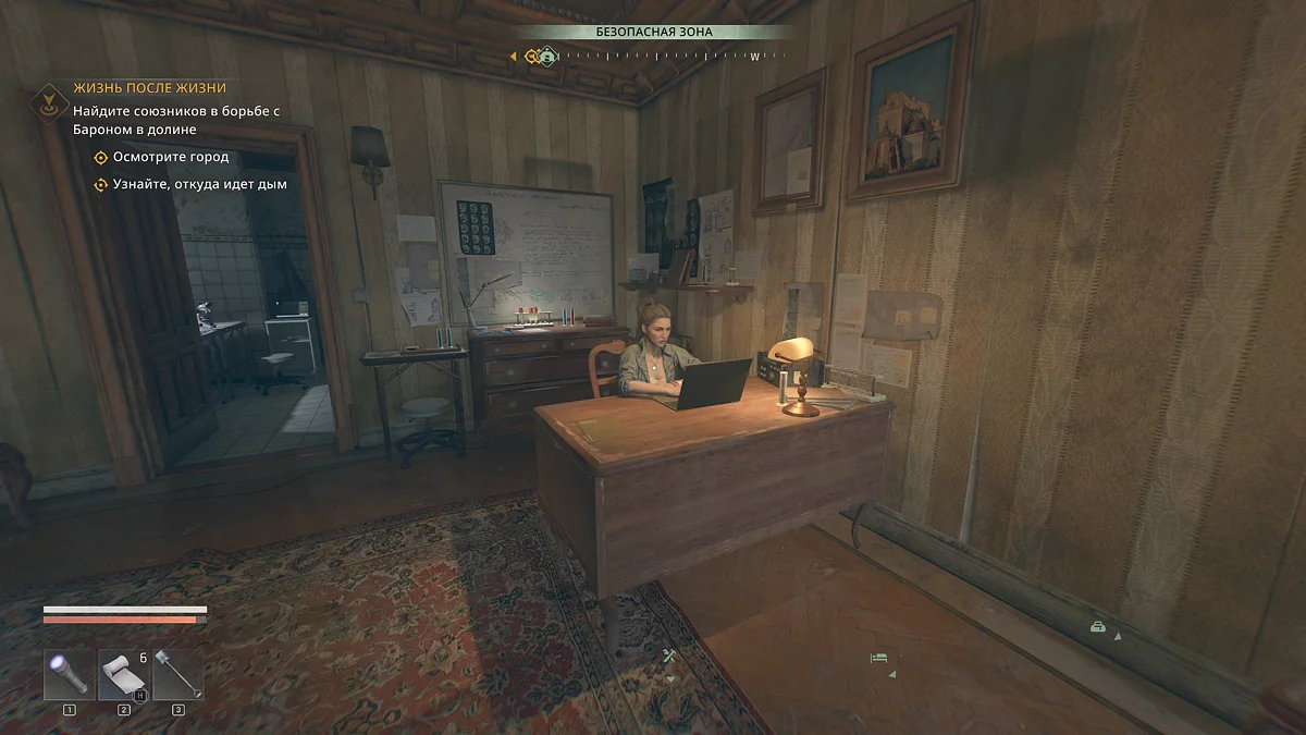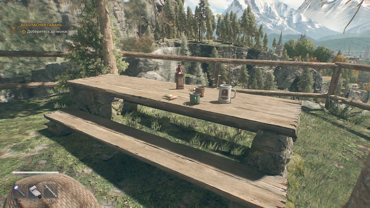 Когда покинете безопасную зону, у вас появится доступ к карте мира и фоторежиму. Чтобы понять, куда следовать дальше, заберитесь на колокольню, спуститесь на крышу и воспользуйтесь биноклем.