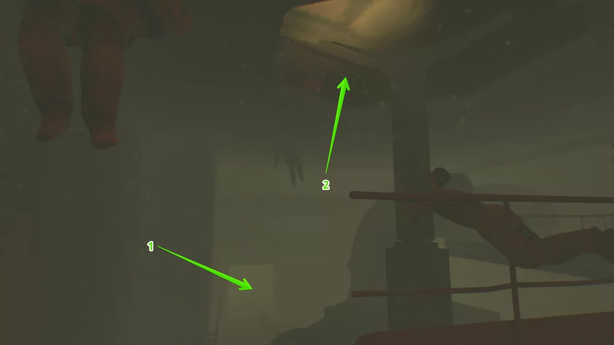 Войдите в лифт, который чуть позже остановится. Оливия покинет радиоэфир, оставив Кайла одного. Выбравшись из кабины, обернитесь, лезьте наверх, отойдите вправо и заберитесь на балку, прыгайте на трубы, а от них налево. Пройдите немного вперёд, посмотрите налево и вверх, где вы увидите вентиляционную шахту, в которую нужно попасть.