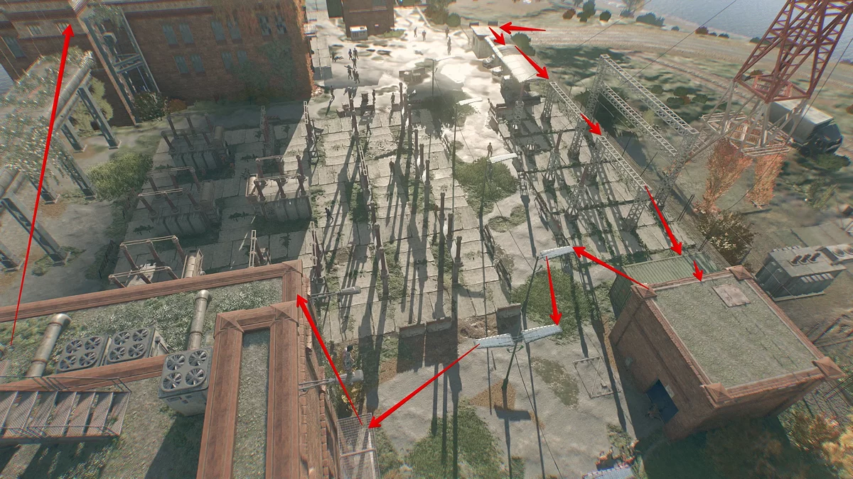 Следуйте от конвоя по трассе на запад, пока не увидите с левой стороны [b]опору ЛЭП. Подобраться к ней не получится, потому что она огорожена высоким забором с колючей проволокой.