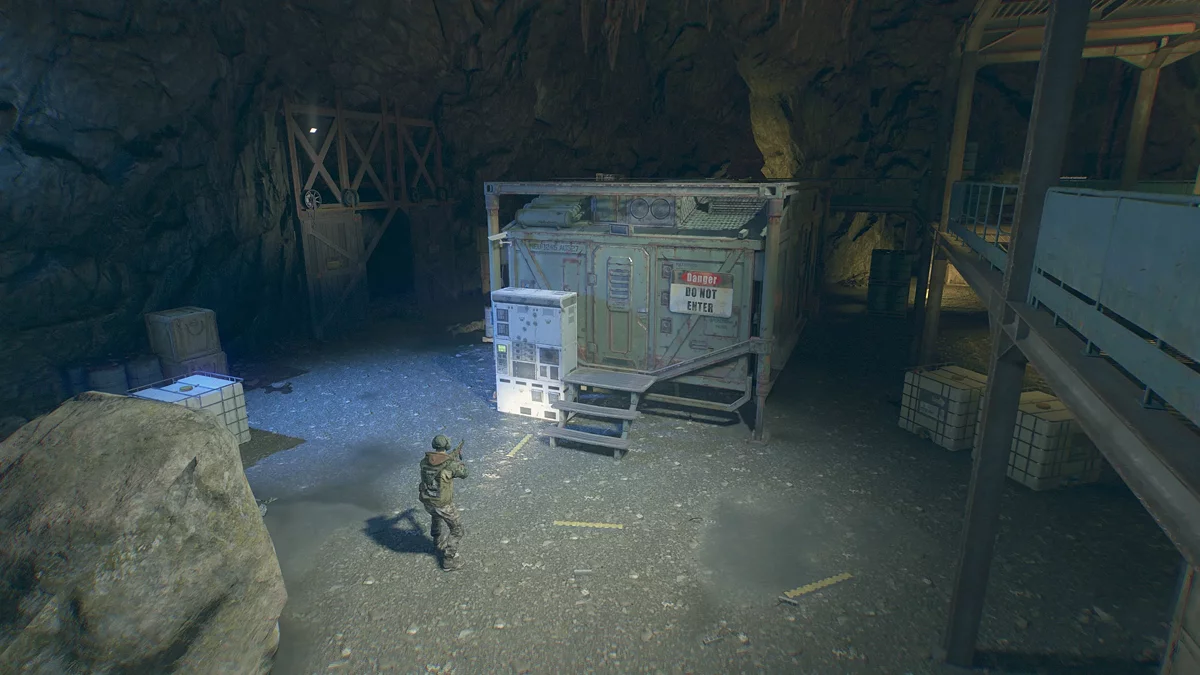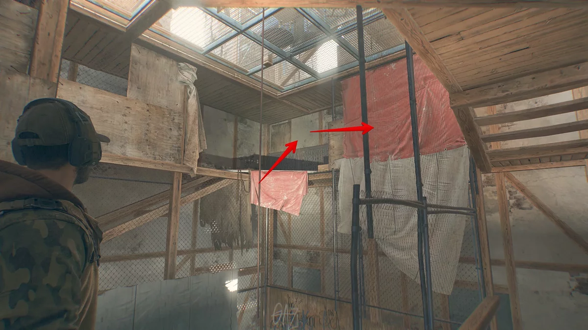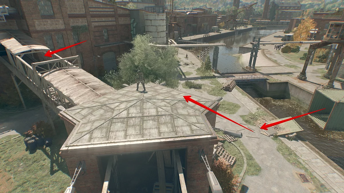 Пересеките водоём с помощью подвешенного зелёного контейнера. Заберитесь на ближайшую крышу и через ленточный транспортер попадите на завод. Спуститесь на первый этаж и в конце паллетов с кирпичами осмотрите узкий проход.