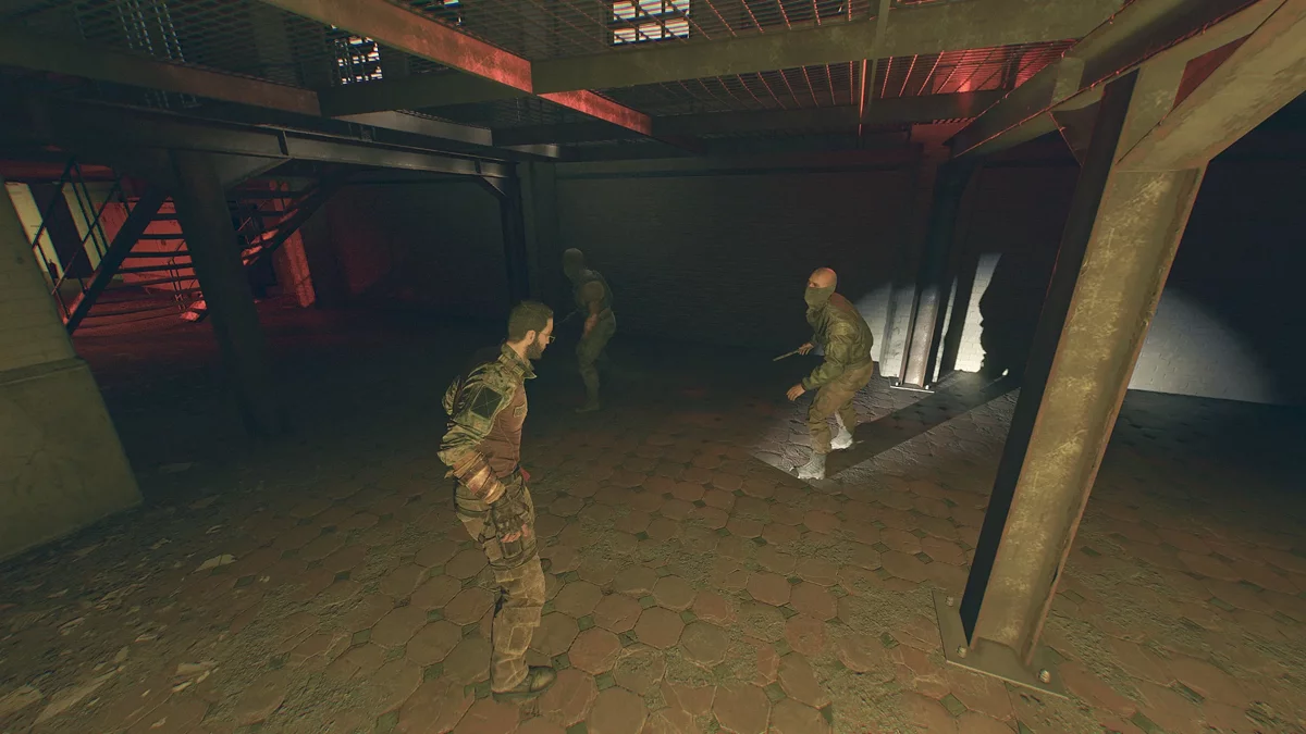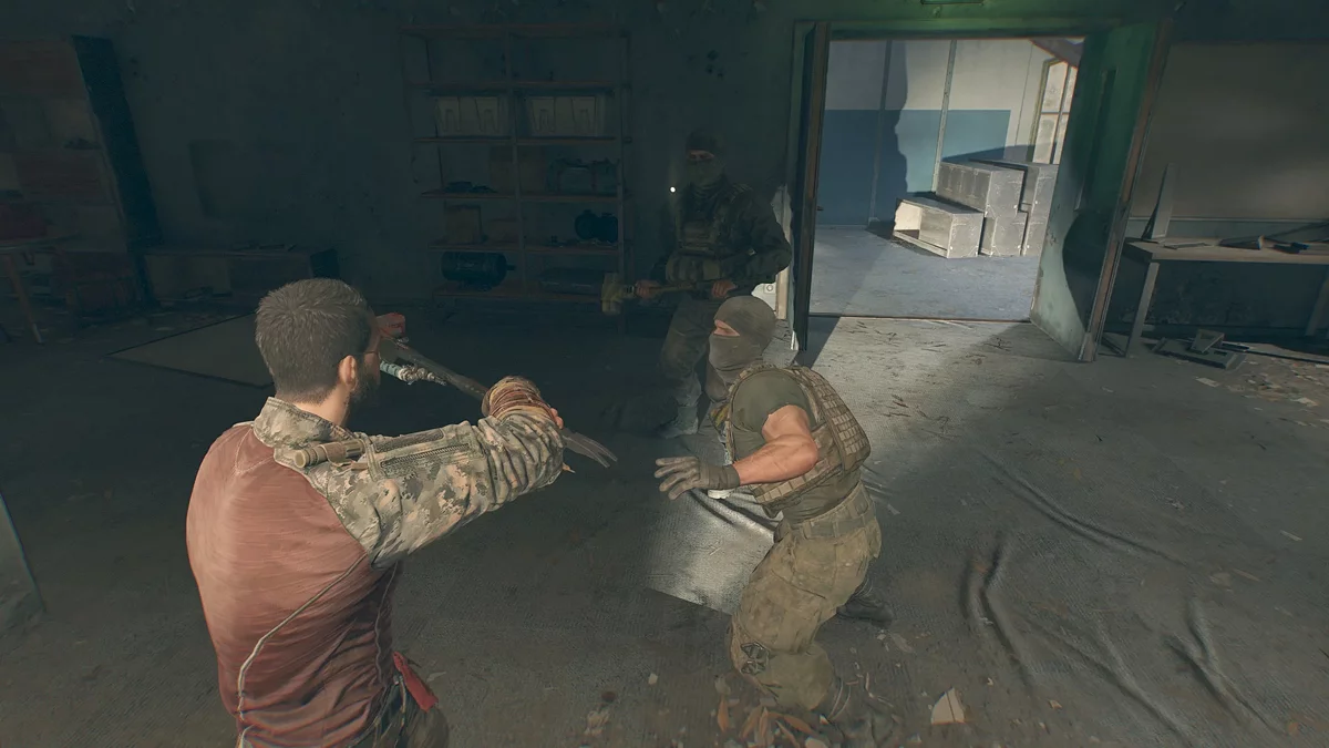 Зайдите в здание через главный вход и увидите, как пленных грузят в грузовик, однако в этот момент на Кайла нападут со спины. Теперь нужно отбиваться от семи стрелков, двух громил и шести бойцов.