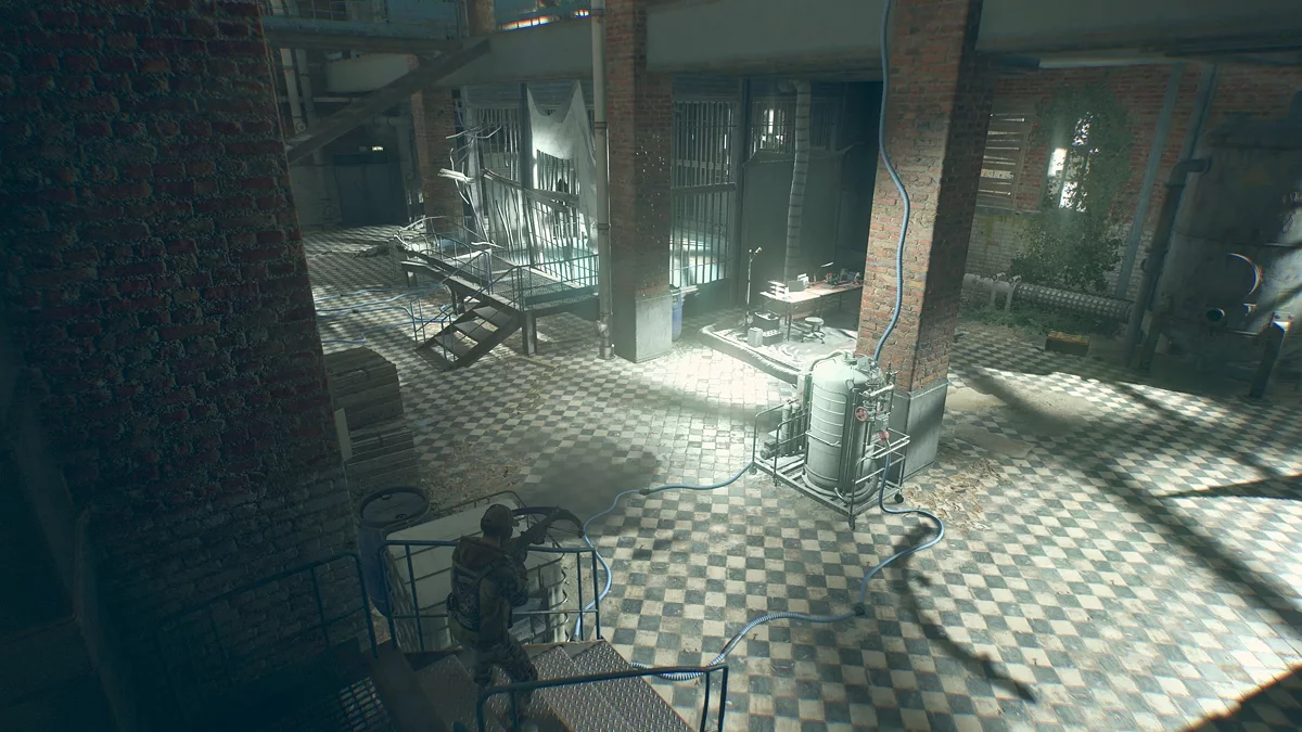 Покинув шахту, вы окажетесь в главной операционной, в которой примерно с десяток зараженных. Поэтому следует воспользоваться тем, что они заняты, и тихо пройти мимо. Сперва пролезьте под большим аппаратом, чтобы попасть в главный зал: в случае, если вас обнаружат, это будет путем для отступления.