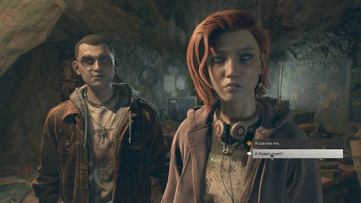 Далее в проходе увидите свечение ультрафиолета, значит, впереди территория бандитов. Поднимитесь на следующий этаж, подойдите к двери справа и взломайте замок. В комнате окажется доктор Камило Марин, которого Кайл решит увести в убежище изгоев.